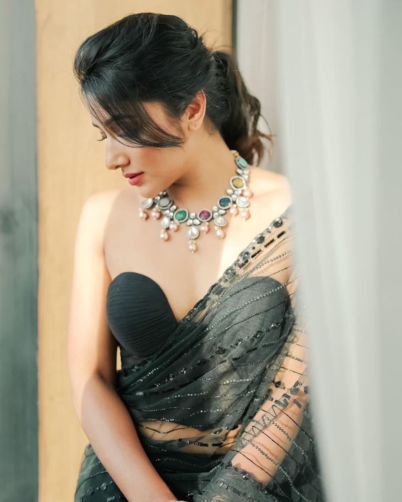 తాజాగా మీర్నా మీనన్ బ్లాక్ శారీలో మెరిసింది. బ్యూటీఫుల్ లుక్ ను సొంతం చేసుకుంది. అలాగే గ్లామర్ షోతోనూ అట్రాక్ట్ చేసింది. స్లీవ్ లెస్ బ్లౌజ్, ట్రాన్స్ ఫరెంట్ శారీలో అందాల ప్రదర్శన చేసింది. మెరిసిపోయే చర్మ సౌందర్యంతో మెస్మరైజ్ చేసింది.