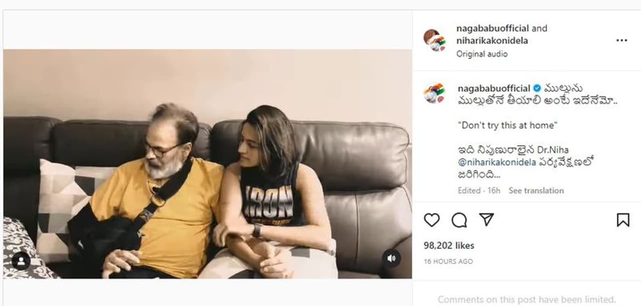 నాగబాబుకు తన కూతురు నిహారిక అంటే ప్రాణం. నిహారికకు కూడా అంతే.. తండ్రి పట్ల అమితమైన ప్రేమ చూపిస్తుంది. ఆ ప్రేమతోనే నిహారిక డాక్టర్ గా మారి నాగబాబుకు చుక్కలు చూపిస్తోంది. కొన్నిరోజులుగా నాగబాబు తన కుడిచేతికి గాయంతో కనిపిస్తున్నారు. చేయి కదపకుండా బెల్ట్ కూడా ధరించారు. వరుణ్ తేజ్ కొత్త మూవీ లాంచ్ లో కూడా నాగబాబు ఇలా గాయంతోనే కనిపించారు.