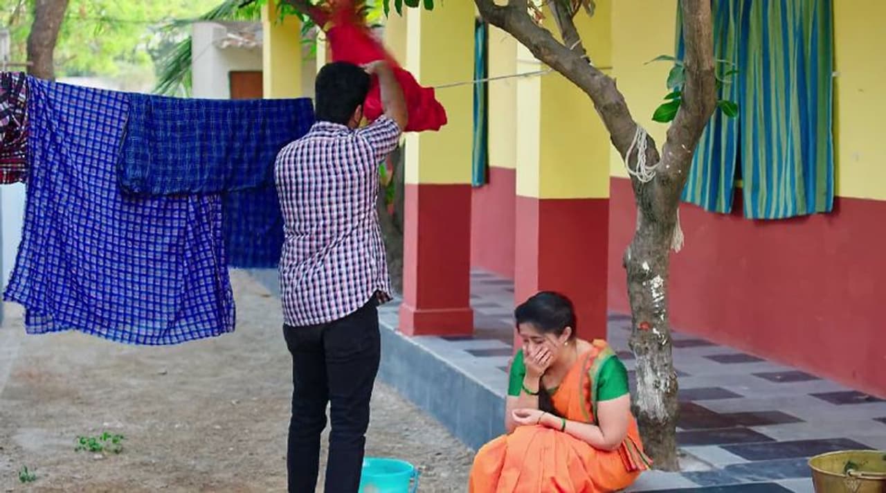 ఇక ఎపిసోడ్ ప్రారంభంలోనే ప్రేమ్ శృతి (Shruthi) చీరను ఆరేయడానికి నానా అవస్థలు పడుతూ ఉంటాడు. అది చూస్తూ శృతి నవ్వుకుంటూ చిల్ అవుతుంది. ఇక ముద్దులు పెడతానని ఆశ పెట్టిన శృతి ప్రేమ్ (Prem) ను కళ్ళు మూసుకోమని చెప్పి అద్దంలో పెడుతూ ఆటపట్టిస్తూ ఉంటుంది.