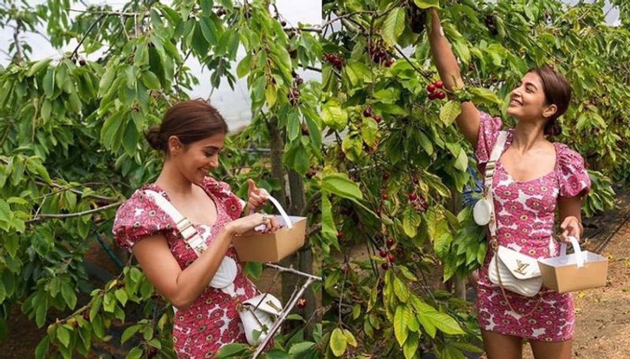 ఈ క్రమంలో తమ పండ్ల తోటలోని చెర్రీ పండ్లను కోస్తూ కనిపించింది. చెట్లపైనుంచి చెర్రీలను సేకరిస్తూ మురిసిపోయింది. దీంతో సేంద్రీయ పద్ధతిలో పండించిన ఫ్రూట్ నే పూజా తినేందుకు ఎక్కువగా ఇష్టపడుతుందని పరోక్షంగా తెలియజేసింది. తోటలో ఫ్రూట్స్ తెంచుతూనే.. ఫొటోలకు అదిరిపోయే స్టిల్స్ ఇచ్చింది.