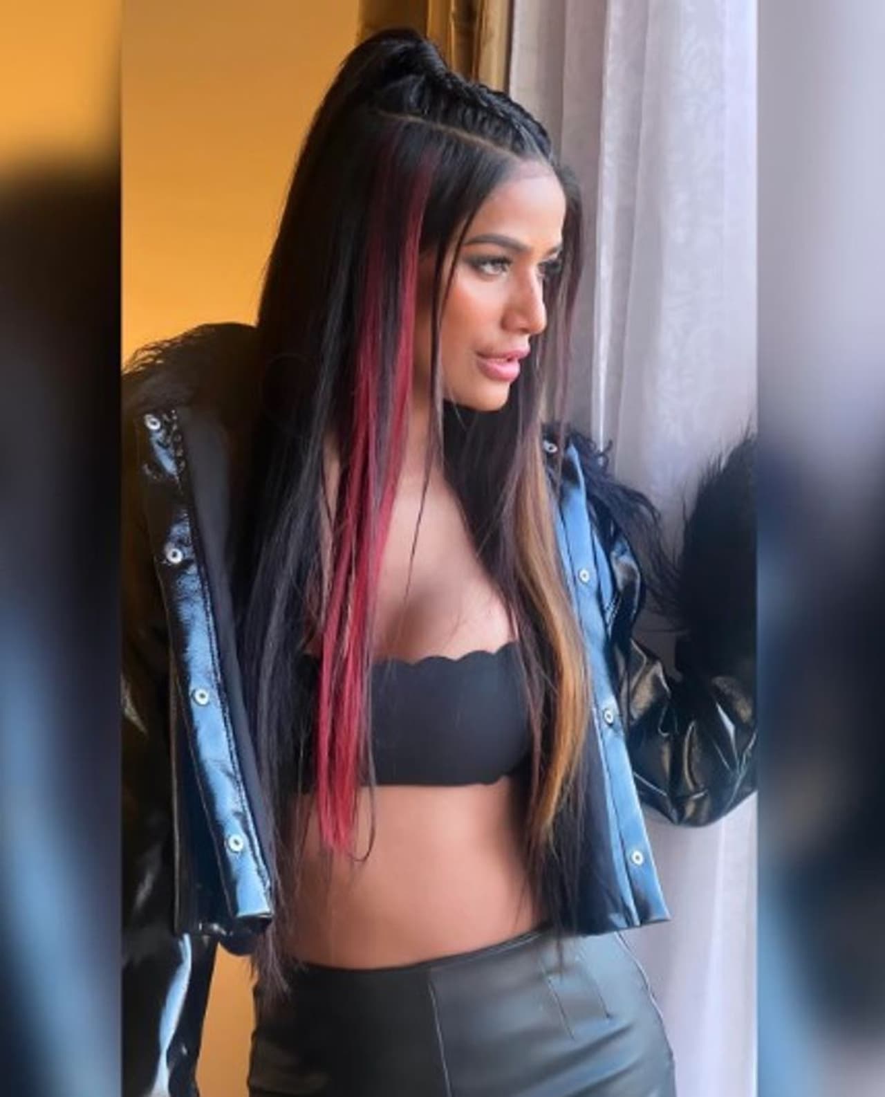 పూనమ్ పాండే విమానాశ్రయంలో కనిపించగానే ఫ్యాన్స్ కొందరు ఆమెని చుట్టుముట్టి ఫోటోలు తీసుకునే ప్రయత్నం చేశారు. వారితో ఈ గ్లామర్ బాంబ్ మాటలు కూడా కలిపింది. బ్లాక్ లెదర్ ప్యాంట్, జాకెట్ ధరించిన పూనమ్.. జాకెట్ విప్పేసి లోపల చూపిస్తూ కవ్వించింది.