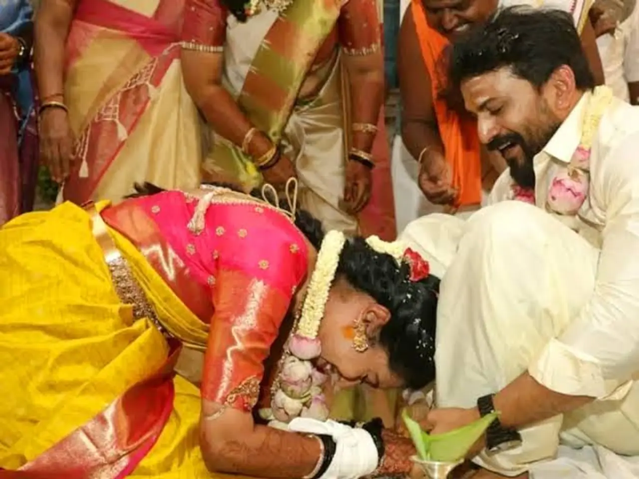 అయితే పెళ్లిలో ఒక ఫన్నీ సంఘటన చోటు చేసుకుంది. చాలా క్యూట్ గా ఉన్న ఈ సంఘటన సోషల్ మీడియాలో వైరల్ గా మారింది. పెళ్ళిలో హిందూ సాంప్రదాయం ప్రకారం భర్త కాళ్ళకి భార్య నమస్కరించడం ఆనవాయితీ. పూజారి ధన్యతని ధనంజయ్ పాదాలకి నమస్కరించమని చెబుతారు. దీనితో ధన్యత అతడి పాదాలు తాకేందుకు ప్రయత్నిస్తుంది. కానీ ధనంజయ్ వద్దు పర్లేదు అని చెబుతాడు.
