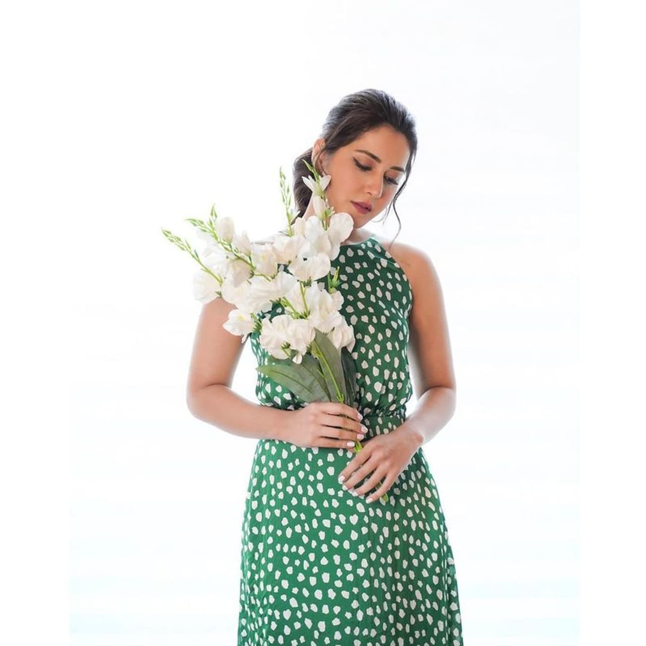 వైట్ డాట్స్ గ్రీన్ కలర్ ట్రెండీ వేర్లో మెరిసింది రాశీఖన్నా. చేతిలో ఫ్లవర్స్ పట్టుకుని అమాయకపు చూపులతో కుర్రాళ్లని రెచ్చగొడుతుంది. క్యూట్ అందాలతో నిద్ర లేకుండా చేస్తుంది.