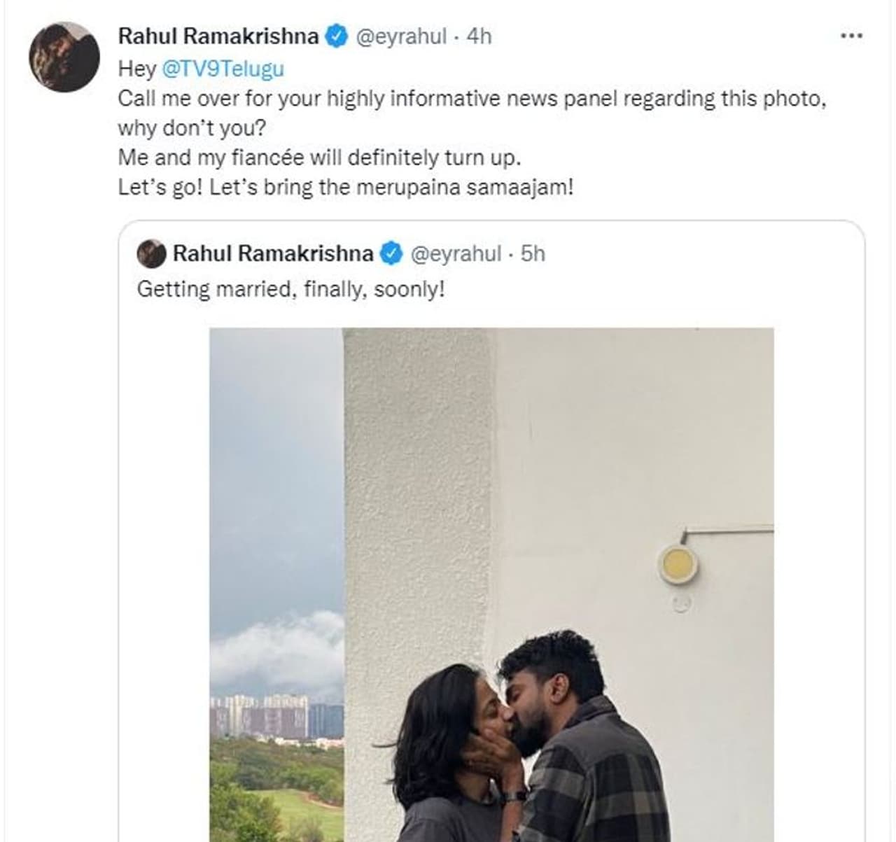 తాజాగా రాహుల్ రామకృష్ణ తన ఫియాన్సీతో ఉన్న ఫోటో విషయంలో కూడా ఆ చానల్ పై సెటైర్లు వేశాడు. ఈ ఫోటోపై మరిన్ని వివరాలు తెలుసుకునేందుకు డిబేట్ పెట్టండి. నేను నా ఫియాన్సీ తప్పకుండా డిబేట్ కి వస్తాం.. మీరు ఇలాంటివి చేస్తారు కదా అంటూ రాహుల్ ఆసక్తికర వ్యాఖ్యలు చేశాడు.