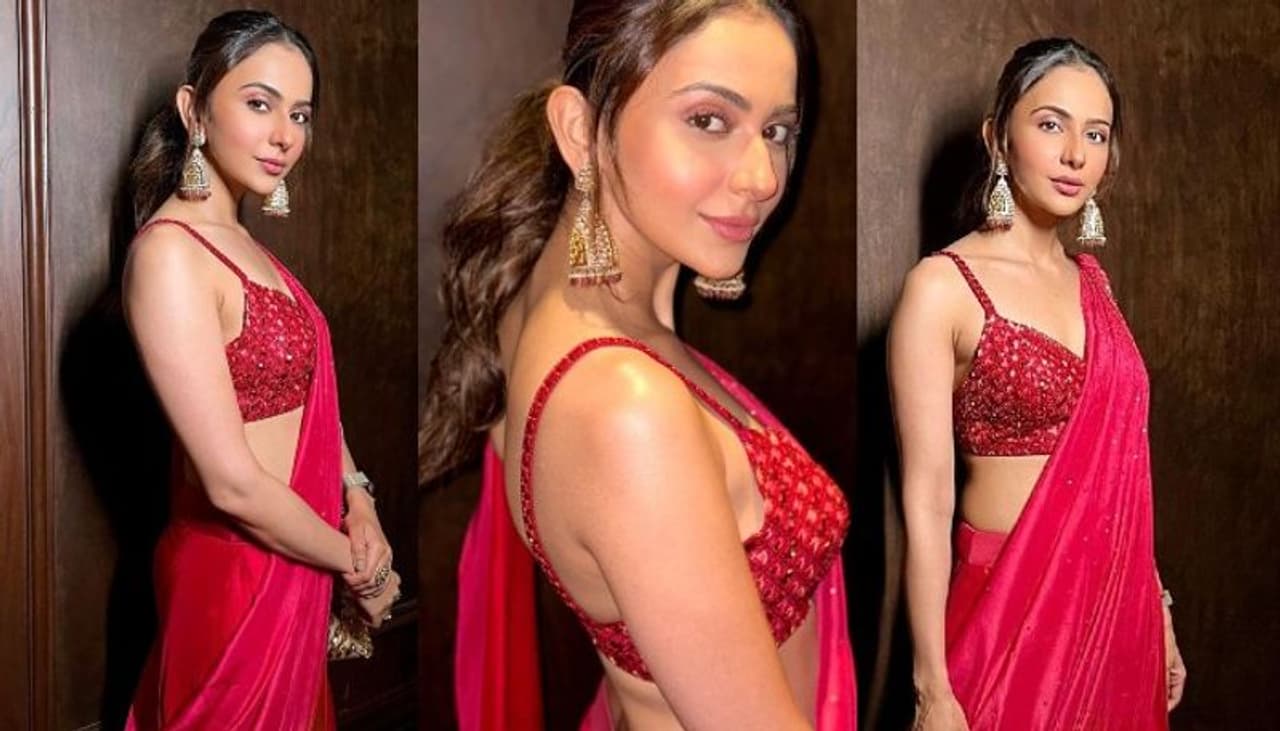 - సైడ్ యాంగిల్ లో టెంప్ట్ చేస్తూ రకుల్ దేశీ లుక్.. విరబూసిన మందారంలా కళ్ళు చెదిరే ఫోజులు