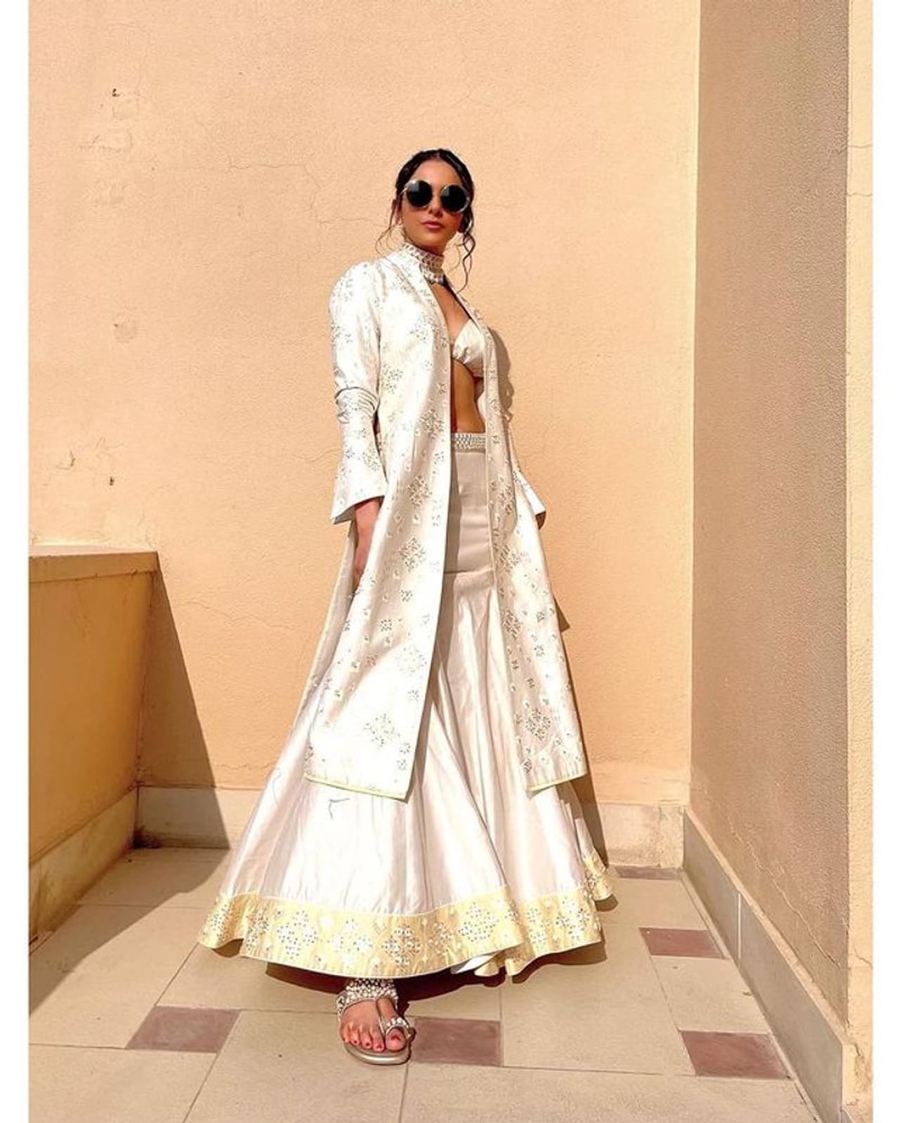 ఈ సందర్భంగా రకుల్ ఆల్-వైట్ బ్రాలెట్ మరియు లెహంగా సెట్ను ధరించింది. ఈ డ్రెస్ లో రకుల్ మరింత హాట్ గా కనిపిస్తోంది. తన ఎద, నడుము అందాలు, నాభి కనిపించేలా డ్రెస్ అప్ అయ్యిందీ సుందరి. మరోవైపు హాట్ లుక్స్ తో కుర్రాళ్ల గుండెల్ని కదిలిస్తోంది. తన ఫొటోలకు ‘తెలుపుపై ప్రేమతో’అని క్యాప్షన్ ఇచ్చింది.