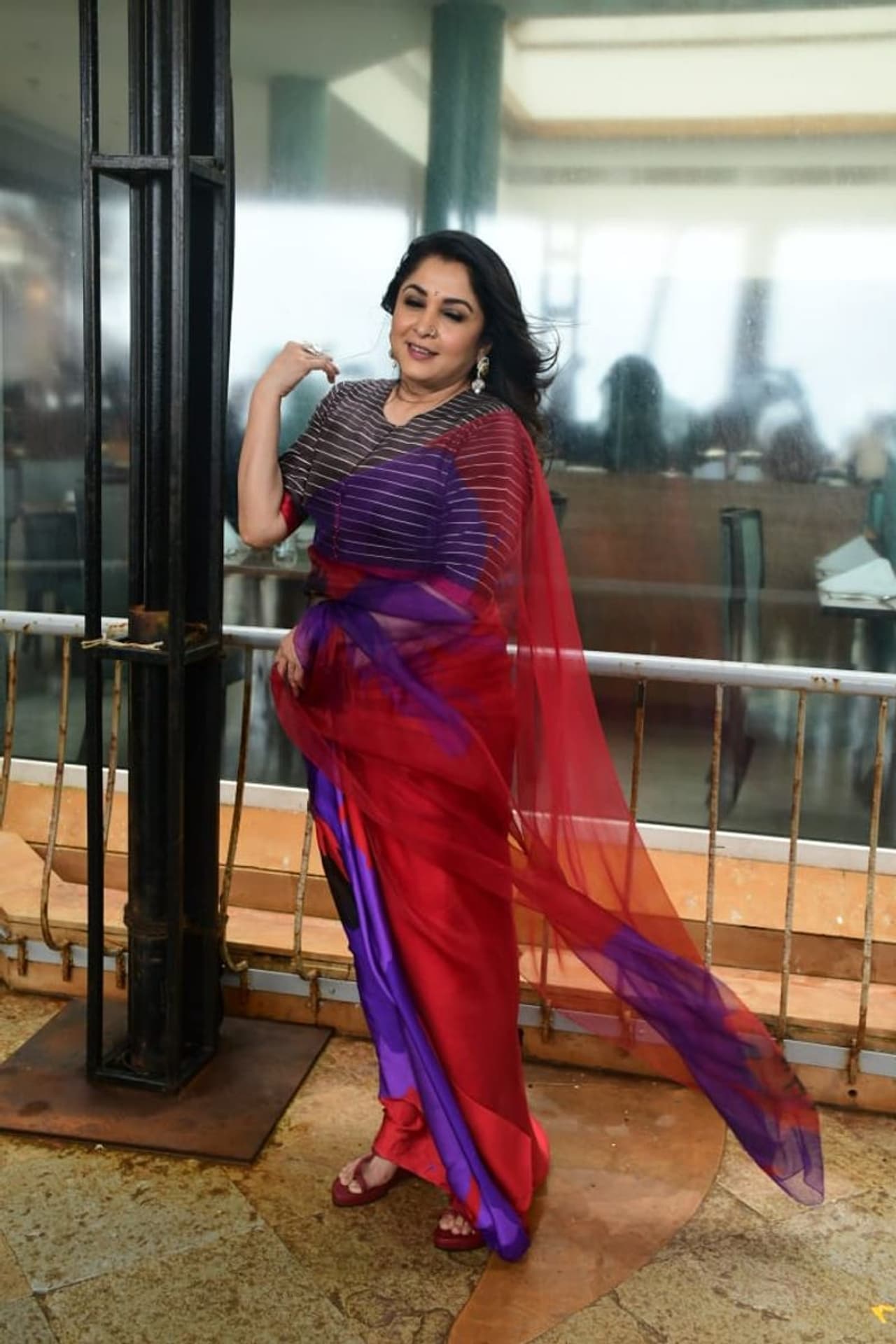 అందులో భాగంగా దిగిన రమ్యకృష్ణ ఫోటో షూట్ పిక్స్ ప్రస్తుతం సామాజిక మాధ్యమాల్లో చక్కర్లు కొడుతున్నాయి. ఇందులో రమ్యకృష్ణ బ్లూ విత్ రెడ్ మిక్స్ గా ఉన్న ట్రాన్స్ ఫరెంట్ శారీలో మెరిసింది. ఈ చీర కొంగు జారిపోతుండగా ఇబ్బంది పడుతూ రమ్యకృష్ణ ఇచ్చిన పోజులు నెటిజన్ల మతిపోగొడుతున్నాయి.