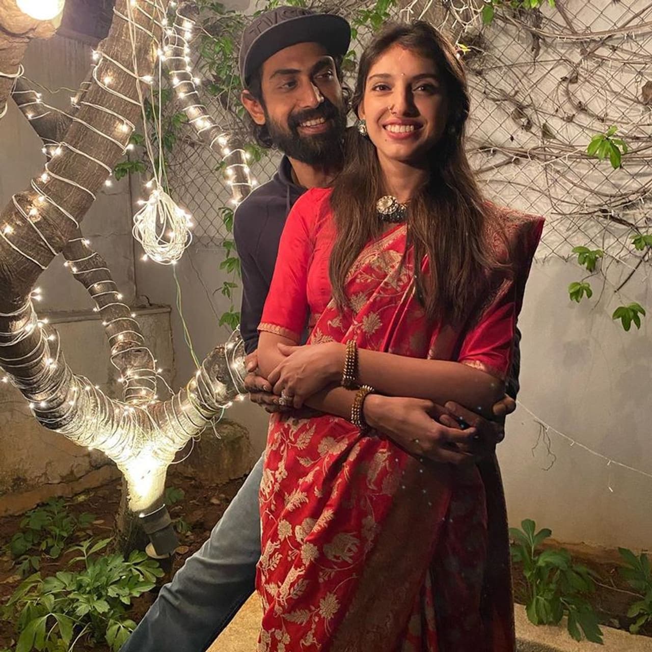 రానా భార్య మిహికా బజాజ్ డిజైనర్ జ్యువెలరీ, సాంప్రదాయ ఎర్ర చీరలో ముస్తాబయ్యారు. ముక్కుకు ధరించిన ముక్కెర చాలా ప్రత్యేకంగా ఉంది. రానా మాత్రం జీన్స్, టి షర్ట్ లో క్యాజువల్ గా కనిపించారు.