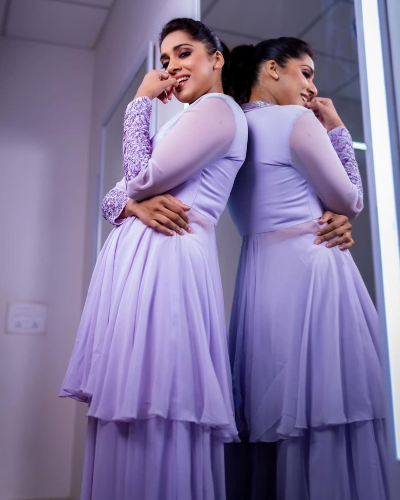 ఇలా ప్రతి వారం డబుల్ ట్రీట్ ఇచ్చినట్టుగానే ఇప్పుడు తన అభిమానులకు డబుల్ ట్రీట్ ఇచ్చింది. తాజాగా ఆమె వాయిలెట్ కలర్ డ్రెస్లో మెరిసింది. అంతేకాదు మిర్రర్లో పోజులిస్తూ మత్తెక్కిస్తుంది.