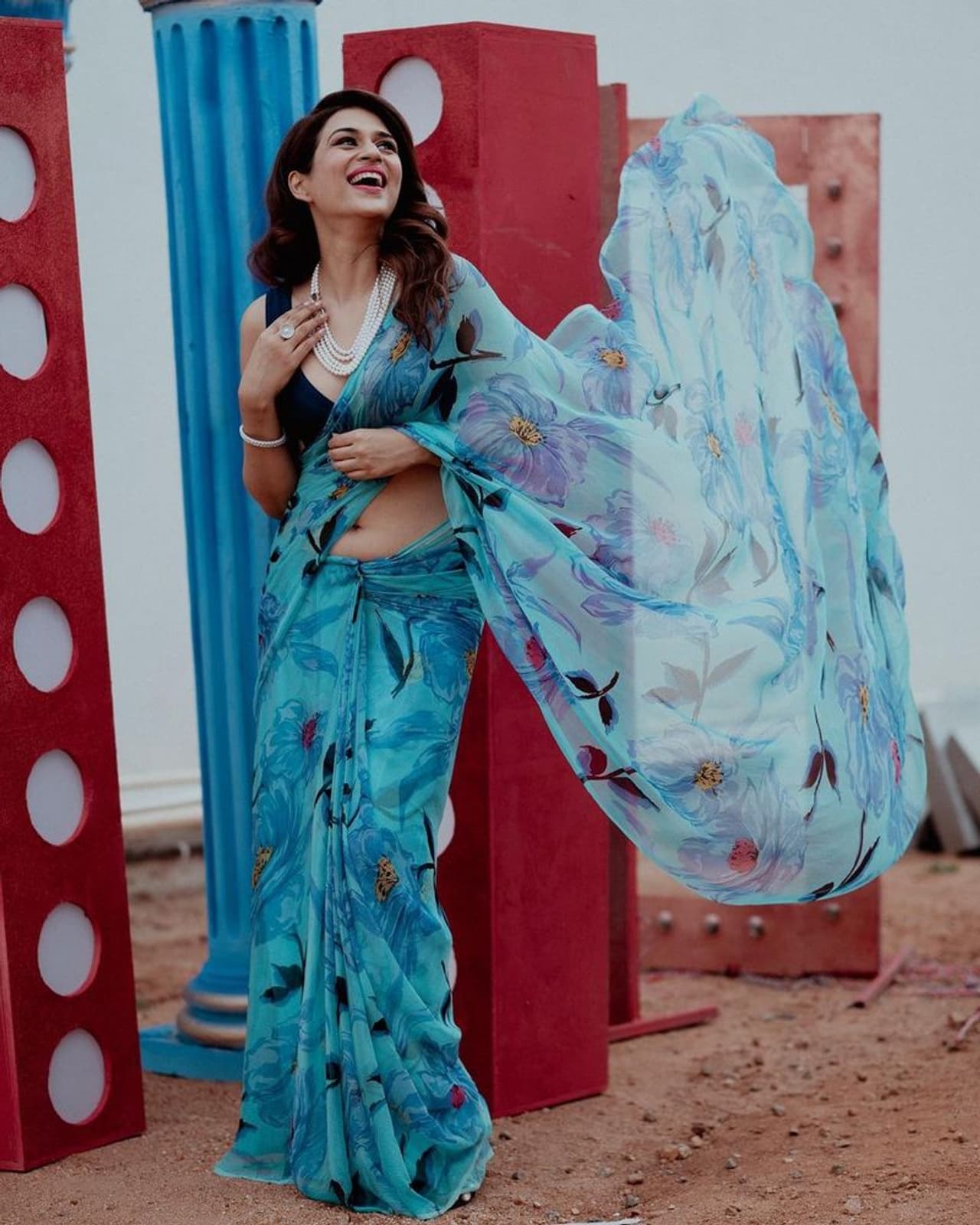 తాజాగా శ్రద్దా దాస్ షేర్ చేసిన హాట్ ఫొటోస్ చూస్తే ఎవ్వరికైనా మైండ్ బ్లాక్ కావాల్సిందే. నెవర్ బిఫోర్ అనిపించేలా శ్రద్దా దాస్ కుర్రాళ్లకు గ్లామర్ ఫీస్ట్ ఇస్తోంది. బ్లూ శారీలో శ్రద్దా దాస్ కళ్ళు చెదిరే విధంగా ఫోజులు ఇస్తోంది.