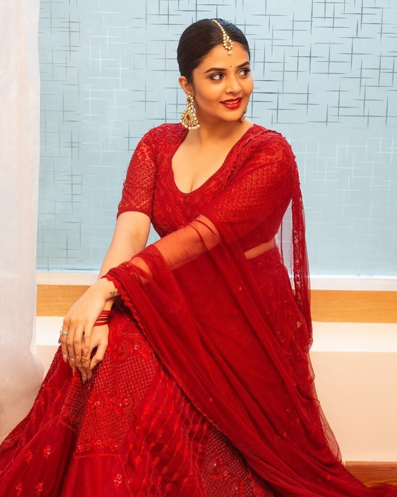 రెడ్ లెహంగా, బ్లౌజ్ లో శ్రీముఖి కుర్రాళ్ళని ఉక్కిరి బిక్కిరి చేస్తోంది. ఈ రేంజ్ హాట్ అండ్ బ్యూటిఫుల్ ఫోజులు శ్రీముఖి నుంచి నెవర్ బిఫోర్ అనే చెప్పాలి. బరువెక్కిన ఎద పరువాలతో ఈ హాట్ యాంకర్ రచ్చ చేస్తోంది.