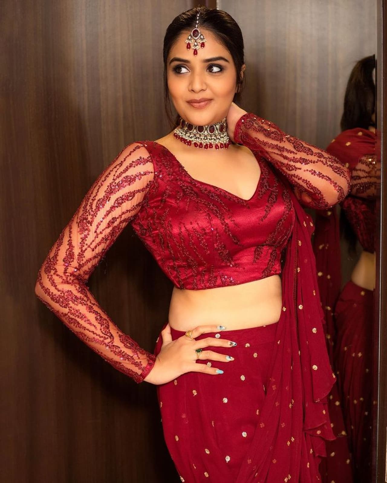 నడుము మొత్తం చూపిస్తూ కుర్రాళ్ళకి కంటిమీద కునుకు లేకుండా చేస్తోంది ఈ హాట్ బ్యూటీ. రెడ్ శారీలో శ్రీముఖి వయ్యారాలు మైండ్ బ్లాక్ అయ్యేలా ఉన్నాయి. కుర్రాళ్లు క్షణం కూడా చూపు తిప్పుకోవడం కష్టం.