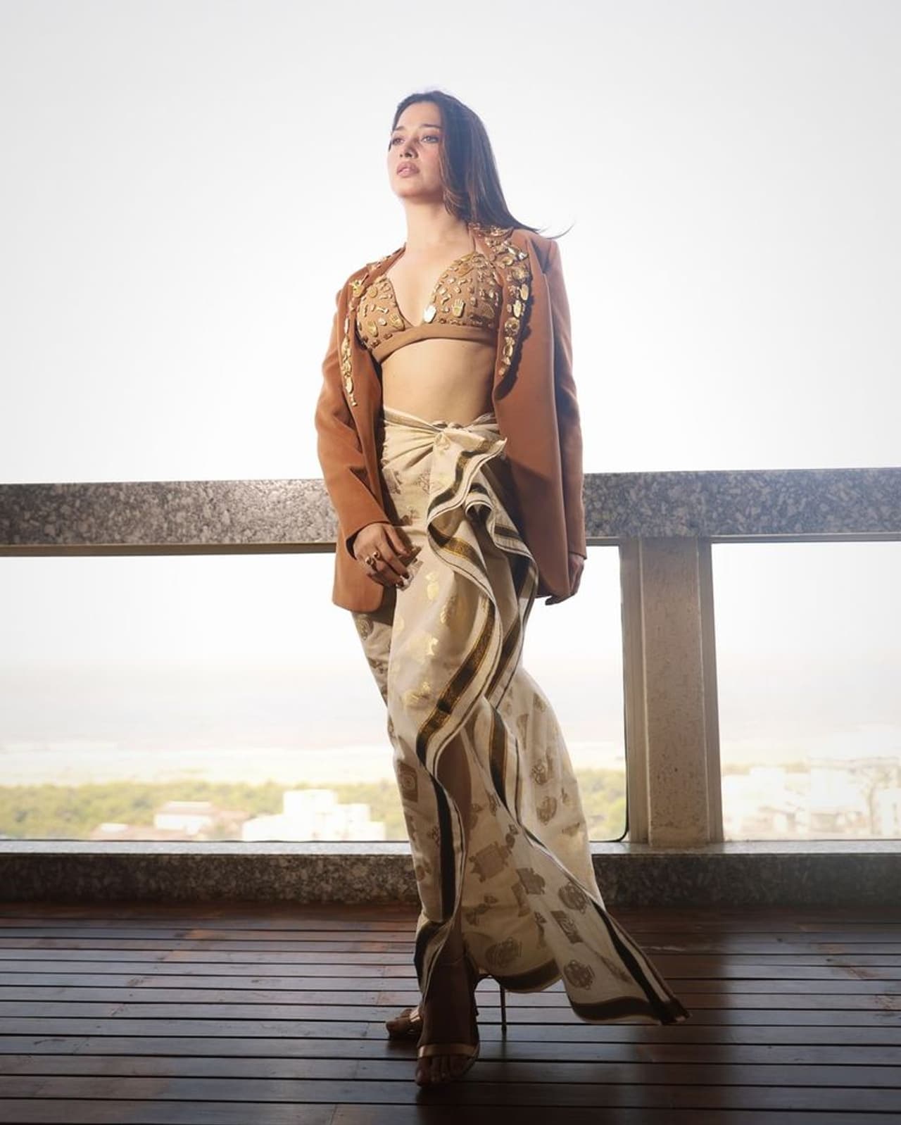 తాజాగా తమన్నా మరోసారి గ్లామర్ ఫోటోషూట్ సోషల్ మీడియాలో పోస్ట్ చేసింది. చాలా వెరైటీగా ఉన్న అవుట్ ఫిట్ లో తమన్నా మెరిసింది. పైన ధరించిన బ్లేజర్ తమన్నా అందాన్ని రెట్టింపు చేసేలా ఉంది. ఈ ఫోటోలు సోషల్ మీడియాలో వైరల్ అవుతున్నాయి.