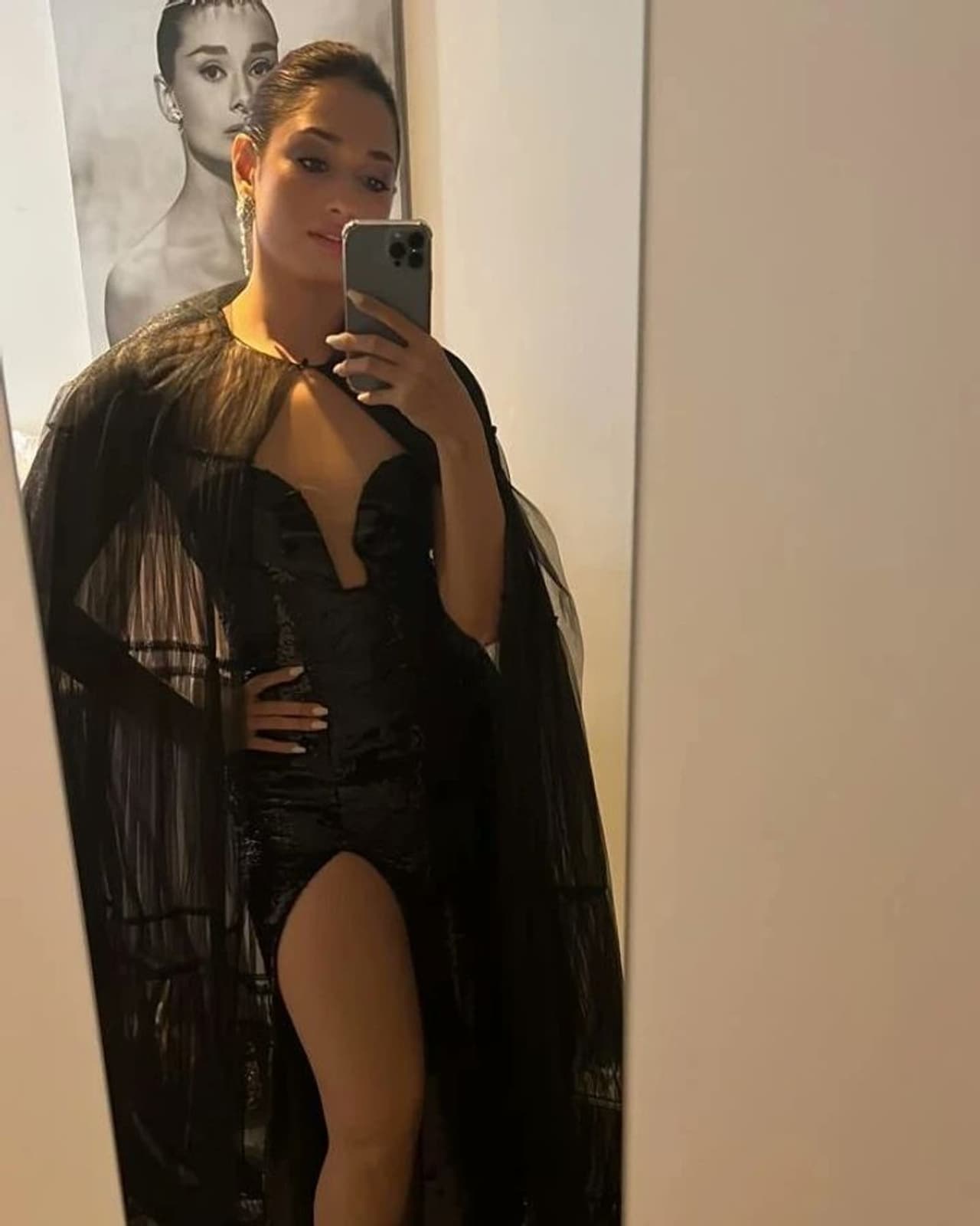 తాజాగా తమన్నా థైస్ స్ల్పిట్ బ్లాక్ డ్రెస్ లో గ్లామర్ మెరుపులు మెరిపిస్తూ చూపరులని ఆకర్షించింది. కళ్ళు చెదిరేలా అందాల వెలుగుతో ప్రతి ఒక్కరిని తమన్నా ఆకర్షిస్తోంది. తమన్నా అందం చూపు తిప్పుకోలేని విధంగా ఉందంటే అతిశయోక్తి కాదు. చిరునవ్వులు చిందిస్తూ తమన్నా ఇచ్చిన ఫోజులు వైరల్ అవుతున్నాయి.