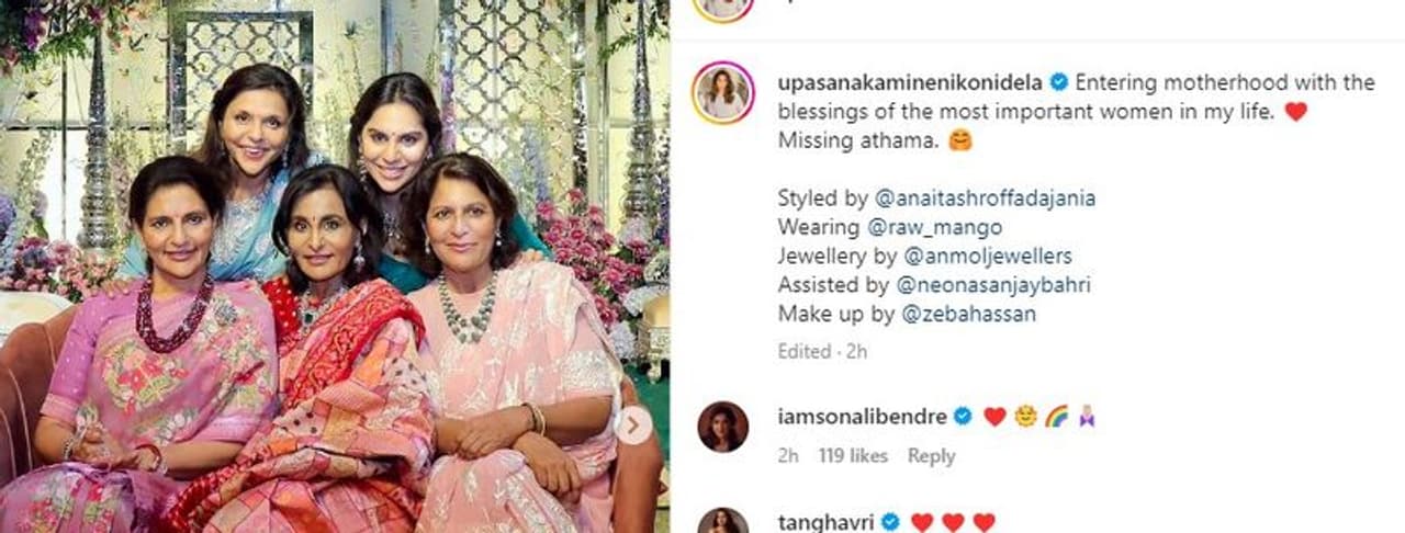 తాజాగా ఉపాసన అత్తగారి ఇంటి నుంచి పుట్టింటికి వెళ్లినట్లు తెలుస్తోంది. ఈ మేరకు ఉపాసన తాజాగా చేసిన పోస్ట్ వైరల్ గా మారింది. నా జీవితంలో ముఖ్యమైన మహిళల ఆశీర్వాదంతో మాతృత్వంలోకి ఎంటర్ కావడం సంతోషంగా ఉంది అంటూ తన తల్లి, అమ్మమ్మ, ఇతర ఫ్యామిలీ మెంబర్స్ తో ఉన్న ఫొటోస్ షేర్ చేసింది.
