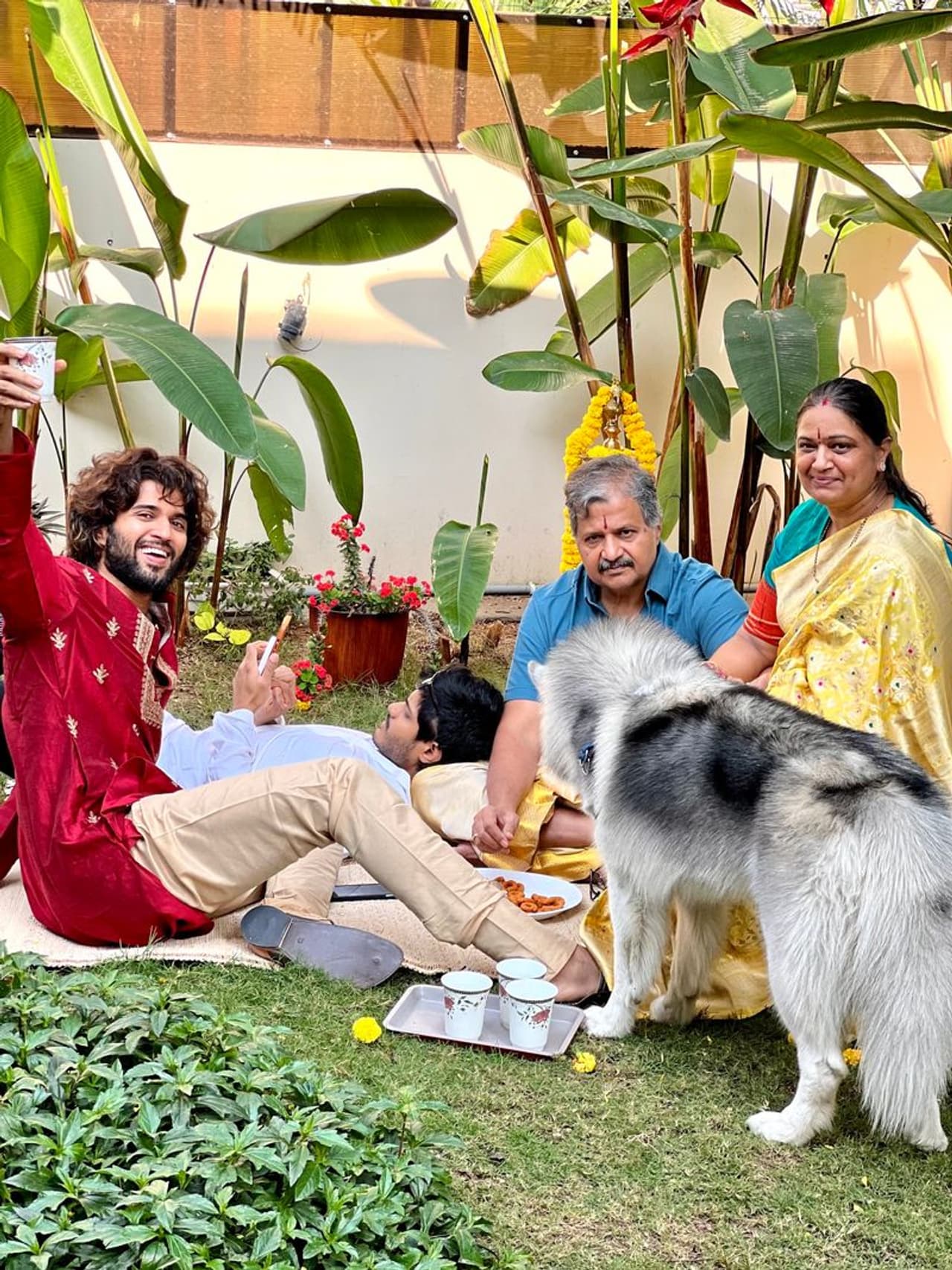 నాన్న గోవర్దన్ రావు, తల్లి మాధవి, తమ్ముడు ఆనంద్ దేవరకొండతో కలిసి పండుగ రోజును సరదాగా గడిపాడు. ఈ సందర్భంగా విజయ్ దేవరకొండ ట్విట్టర్ లో తన ఫ్యాన్తో పండుగకు సంబంధించిన ఫొటోలను షేర్ చేశాడు. తన ప్రియమైన వారందరికీ సంక్రాంతి శుభాకాంక్షలు తెలిపారు. ఈ ఫొటోలో విజయ్, ఆనంద్ దేవరకొండ (Anadh devarakonda) ట్రెడిషినల్ డ్రెస్ లు ధరించి సంప్రదాయం బద్ధంగా తయారయ్యారు.