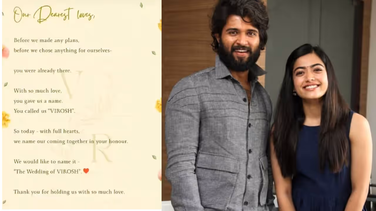 ఇక ఎట్టకేలకు పెళ్లిపై ఇద్దరు ఒకేసారి సోషల్ మీడియా ప్రకటన చేశారు. తాము చెప్పకముందే అభిమానులు అన్నీ చేస్తున్నారని. తమ జంటకు విరోష్ అని పేరు కూడా పెట్టారని.అభిమానుల కోరిక మేరకు తమ పెళ్లికి వెడ్డింగ్ ఆఫ్ విరోష్ అని పేరు పెట్టుకుంటున్నట్టు ప్రకటనలో తెలిపారు విజయ్ దేవరకొండ. ఈ ప్రకటనతో పాటు పెళ్లి కార్డును కూడా వారు పోస్ట్ చేశారు.