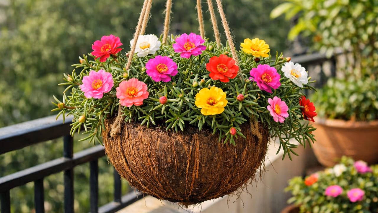 మీకు పూలు పూసే హ్యాంగింగ్ ప్లాంట్ కావాలంటే పోర్టులాకా మంచి ఆప్షన్. దీని రంగురంగుల పువ్వులు బాల్కనీని చాలా ఆకర్షణీయంగా మారుస్తాయి. కొబ్బరి చిప్పలో దీని వేర్లు సులభంగా పాతుకుపోతాయి. ఇది ఎండలో బాగా పెరుగుతుంది.