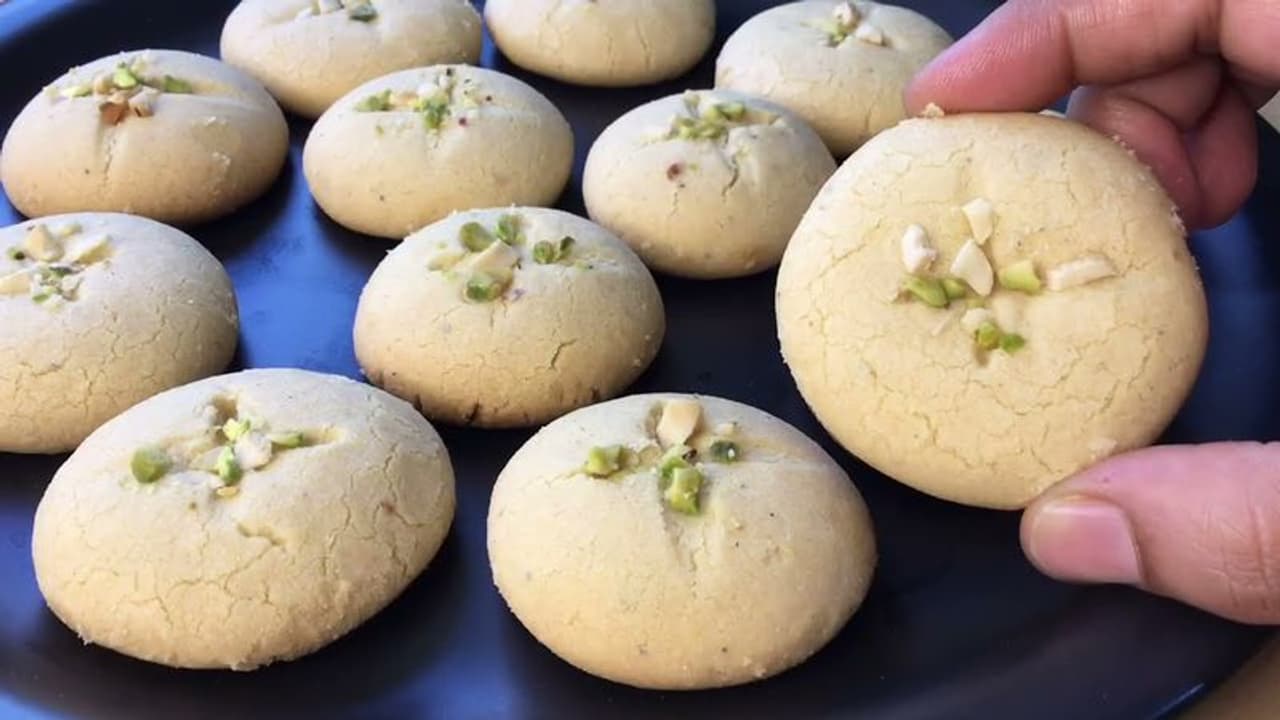 ఇప్పుడు స్టవ్ మీద ఒక పెద్ద గిన్నె పెట్టి అందులో ప్లేట్ కానీ, స్టాండ్ కానీ పెట్టి పది నిమిషాల పాటు తక్కువ మంట (Low flame) మీద ఫ్రీ హీట్ (Preheat) చేసుకోవాలి. ఇప్పుడు పిండిని చిన్న చిన్న ఉండలుగా చేసుకుని చేతివేళ్లతో బిస్కెట్ల ఆకారంలో గుండ్రంగా వత్తుకోని పైన జీడిపప్పు పలుకులతో గార్నిష్ చేసుకోవాలి.