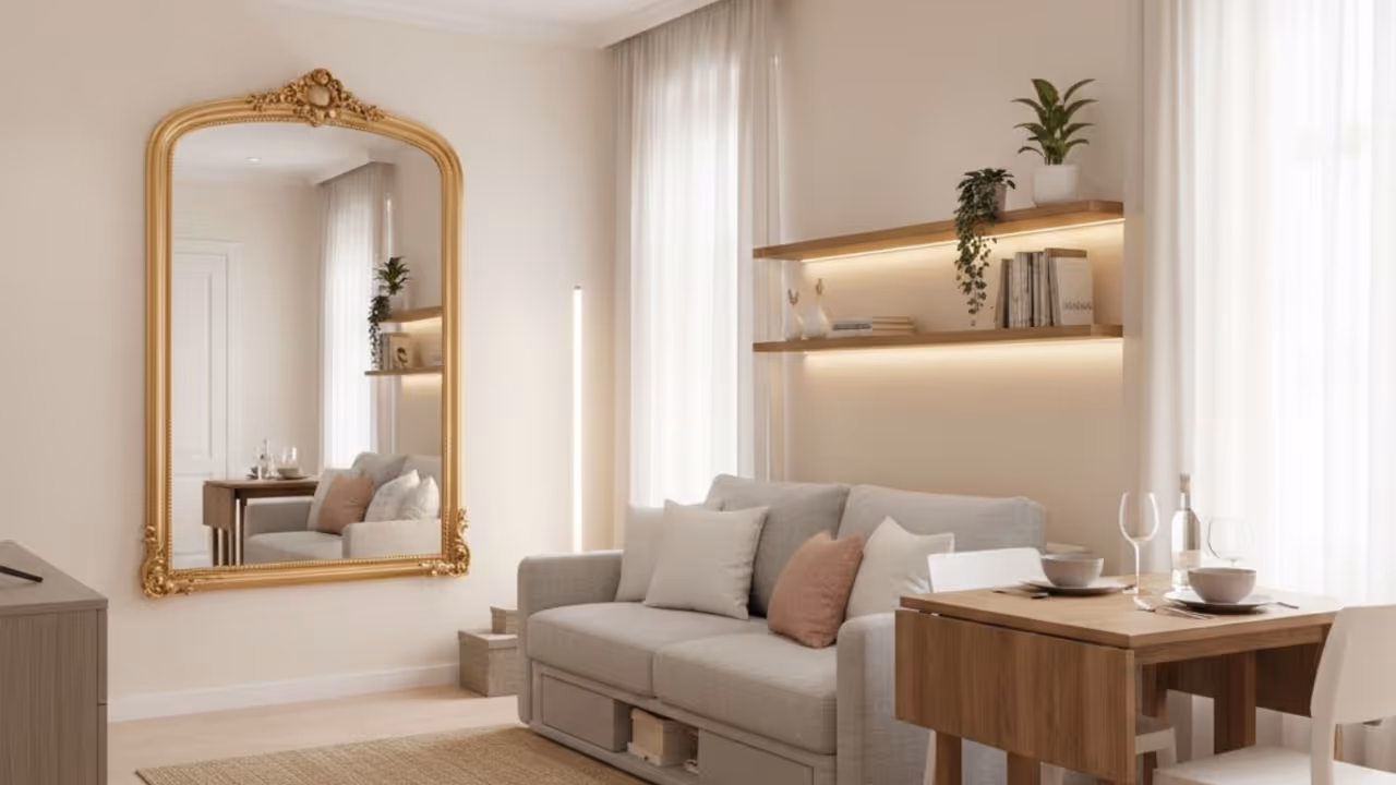 చిన్న ఇంటిని పెద్దగా చూపించడానికి అద్దాలు చాలా ఉపయోగపడతాయి. గోడపై పెద్ద మిరర్ పెట్టితే గది రెట్టింపు పరిమాణంలో కనిపిస్తుంది. అద్దాలు లైట్ను రిఫ్లెక్ట్ చేయడంతో గది బ్రైట్గా, ఓపెన్గా ఉంటుంది. లివింగ్ రూమ్, డైనింగ్ ఏరియా లేదా బెడ్రూమ్లో ఒక పెద్ద అద్దం పెట్టొచ్చు. మిరర్ ఉన్న అల్మారాలు లేదా ఫర్నిచర్ వాడితే లగ్జరీ టచ్ వస్తుంది.