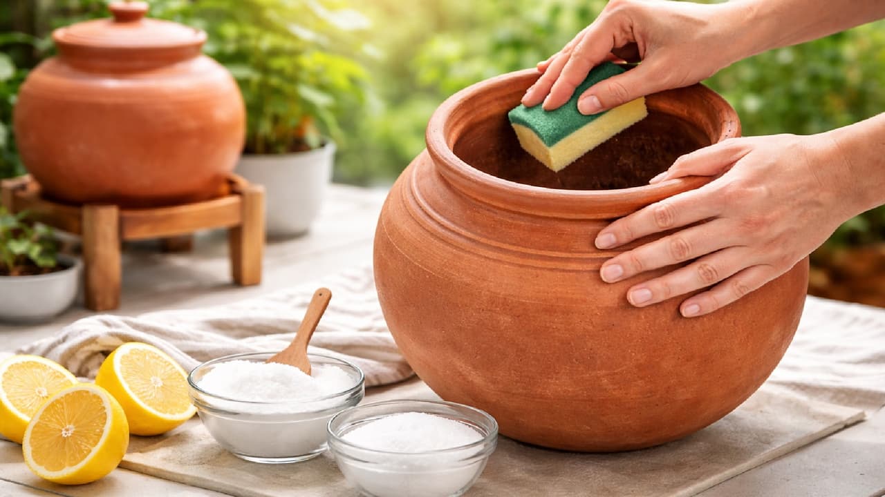 మట్టికుండను వాడే ముందు పరిశుభ్రం చేసుకోవాలి. కుండను వాడేటప్పుడు ప్రతి 2 నుంచి 3 రోజులకు ఒకసారి కుండను క్లీన్ చేయడం ఉత్తమం. ఇలా చేయడం వల్ల కుండలో ఉండే మలినాలు, వాసనలు తొలగిపోతాయి. కుండను శుభ్రం చేసే సమయంలో సబ్బులు, కెమికల్ క్లీనర్లు వాడకూడదు. ఇవి కుండలోని రంధ్రాలలో ఇరుక్కుపోయి నీటి రుచిని చెడగొడతాయి. అందుకే సహజ పదార్థాలు వాడాలి. నిమ్మరసం, ఉప్పు లేదా బేకింగ్ సోడా వంటివి ఉపయోగిస్తే కుండలోని మురికి సులభంగా తొలగిపోతుంది. ముందుగా కుండలో నీరు పోసి కొద్దిసేపు నానబెట్టి, తర్వాత ఈ పదార్థాలతో మెల్లగా రుద్దితే మంచి ఫలితం కనిపిస్తుంది.