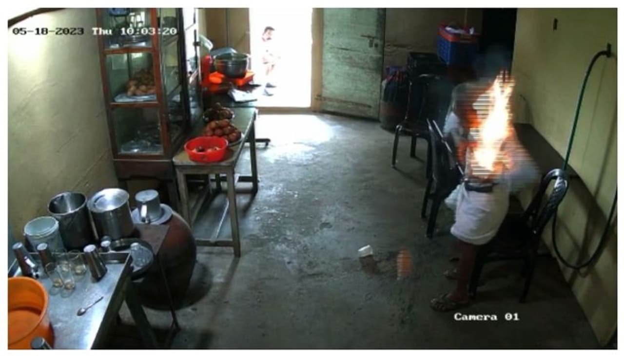 మంటలు గమనించిన వృద్ధుడు వెంటనే పైకి లేచి, అతని టీ గ్లాసు మీద పడవేసి, పిచ్చిగా తన జేబులో నుండి ఫోన్ తీయడానికి ప్రయత్నించాడు. అతని జేబులో నుండి నేలపై పడిపోయింది. అతని వెర్రి ప్రయత్నాలే అతనిని రక్షించాయి. అతనికి గాయాలవ్వకుండా బయటపడ్డాడు.