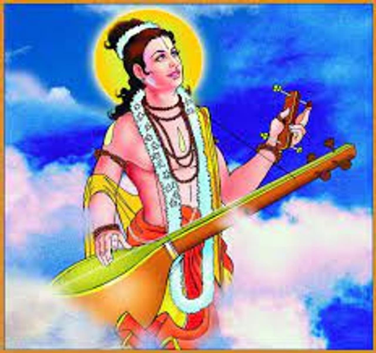 బ్రహ్మ సమక్షంలో నారదముని తన గాన నైపుణ్యాలను బయటపెడతాడు. దాంతో తండ్రి (బ్రహ్మ)ఎంతో సంతోషపడిపోయి హరిభక్తిని భోదిస్తాడు. అప్పటి నుంచి నారదుడు హరినామ సంకీర్తణను చెబుతూ లోక సంచారిగా మారిపోయాడు.