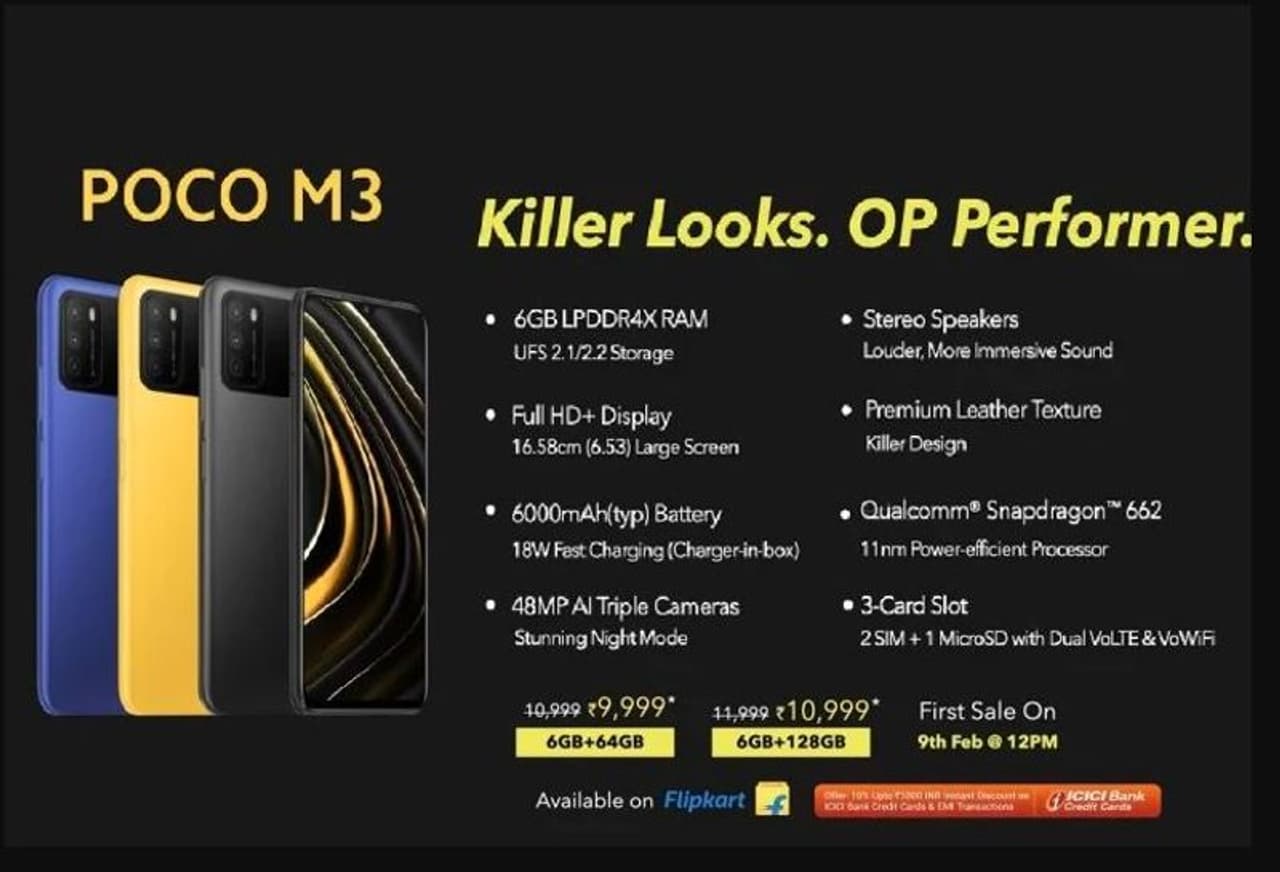 భారతదేశంలో పోకో ఎం3 ప్రారంభ ధర రూ .10,999. ఈ ధర వద్ద 6 జీబీ ర్యామ్తో 64 జీబీ స్టోరేజ్ లభించగా, 6 జీబీ ర్యామ్, 128 జీబీ స్టోరేజ్ వేరియంట్ ధర రూ .11,999. మీరు ఐసిఐసిఐ బ్యాంక్ కార్డుతో కొనుగోలు చేస్తే లేదా ఫోన్ను ఇఎంఐలో కొనుగోలు చేస్తే మీకు క్యాష్ బ్యాక్ కూడా పొందవచ్చు. ఈ పోకో ఎం3 కూల్ బ్లూ, పోకో ఎల్లో, పవర్ బ్లాక్ కలర్ వేరియంట్లలో లభిస్తుంది. ఈ ఫోన్ 9 ఫిబ్రవరి 2021 నుండి ఫ్లిప్కార్ట్ ద్వారా అమ్మకానికి వస్తుంది.