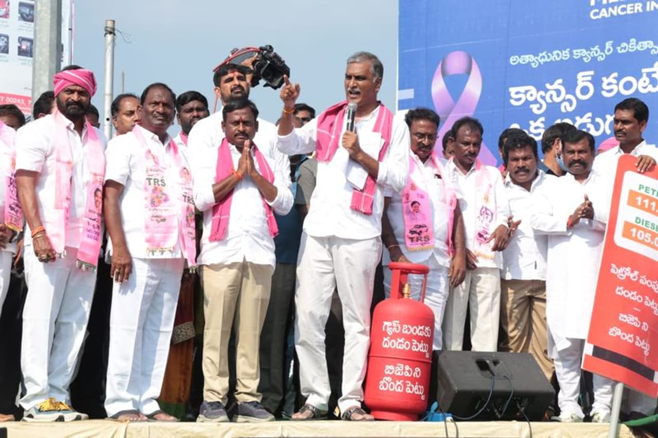 ''70 ఏళ్ల పాలనలో రైతులకు డబ్బు ఏ ప్రభుత్వం ఇవ్వలేదు. రైతులతో నీటి తీరువా, భూమి శిస్తు కట్టించారు. కానీ రైతుబంధు ఇస్తూ రైతుకు శిస్తు కడుతున్న ప్రభుత్వం టీఆర్ఎస్ ప్రభుత్వం... ఉచిత కరెంటు ఇచ్చింది టీఆర్ఎస్ ప్రభుత్వం. ఎండాకాలం యాసంగి పంట వేయాలంటే రైతులు నీళ్లు లేక బాధపడేవాళ్లు... మొఖాన్ని మొగులుదిక్కు పెట్టి చూసేవాళ్ళు... అనుమానం మీద నారు పోసేవాళ్ళు.. పొట్టకు వచ్చే వరకు నీళ్లు అందక పంటలు ఎండిపోయేవి. షెట్టర్లు పగులగొట్టేవాళ్ళు... కాలువలు తెగ్గొట్టేవాళ్ళు... ఎవరైనా కాలువకు మోటార్లు పెడితే ఎమ్మార్వో ఆఫీసు వాళ్ళు వచ్చి పైపులు కోసేవాళ్ళు. మోటార్లు జీపులో వేసుకుపోయేవాళ్లు.దీంతో రైతులు ధర్నాలు చేసేవాళ్ళు.. ఇప్పుడు ఆ బాధలు ఉన్నాయా? బ్రహ్మాండంగా కాళేశ్వరం నీళ్లు ఇస్తున్నాం... నీళ్లు ఇక చాలు.. బంద్ చేయండి అనే దాకా ఇస్తున్నాం'' అని హరీష్ పేర్కొన్నారు.