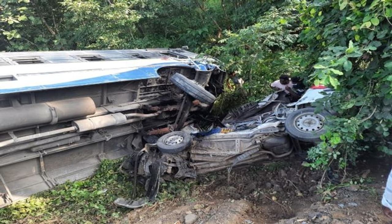 ఆర్టిసి బస్సు-కారు ఢీకొన్న తర్వాతకూడా అక్కడే ఆగిపోకుండా లోయలోకి దూసుకుపోయాయి. దీంతో కారు తుక్కుతక్కయి డ్రైవింగ్ సీట్ లో వున్న తాటి వినీత్(22) అక్కడికక్కడే మృతి చెందాడు. బస్సు డ్రైవర్, కండక్టర్ తో పాటు ప్రయాణికులు గాయపడ్డారు