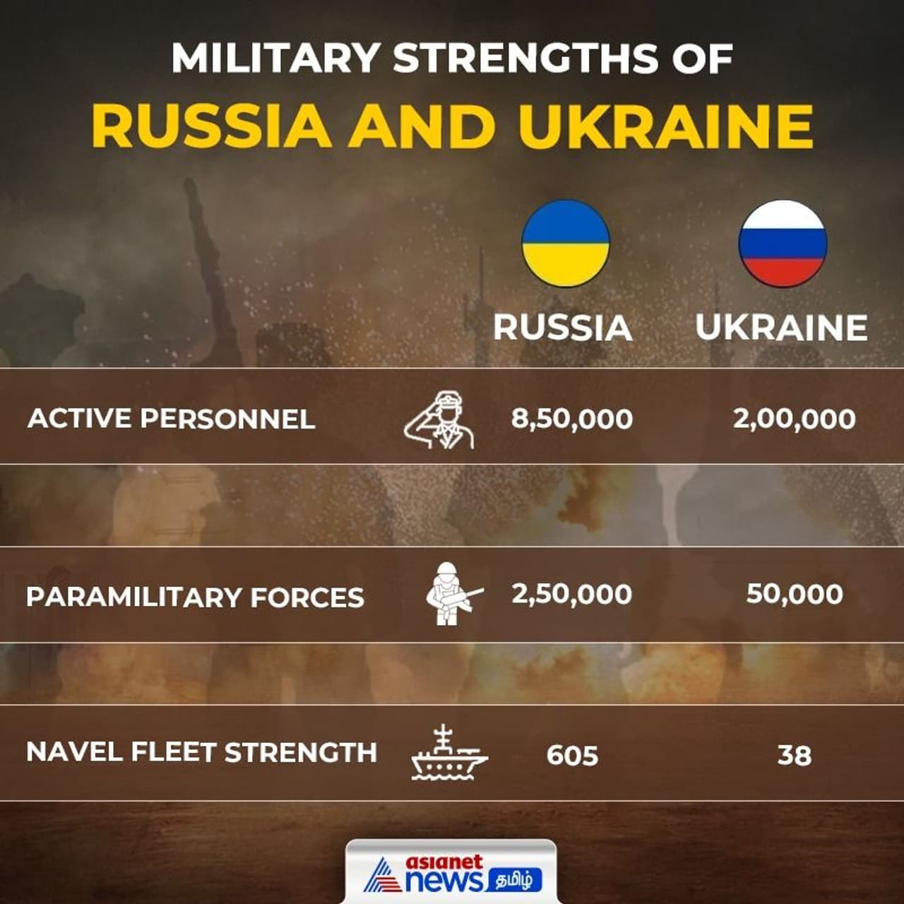 గ్లోబల్ ఫైర్పవర్ 2021, ఇంటర్నేషనల్ ఇన్స్టిట్యూట్ ఫర్ స్ట్రాటజిక్ స్టడీస్ (IISS) లండన్ ప్రకారం.. రష్యా బలం ఉక్రెయిన్ కంటే ఎక్కువ. కాబట్టి, ఉక్రెయిన్ కు నాటో మద్దతు చాలా కీలకం. రష్యాలో 30,14,000 మంది సైనికులు ఉండగా అందులో 10,14,000 యాక్టివ్ సైనికులు ఉండగా.. ఉక్రెయిన్లో 11,55,000 మంది సైనికులు అందులో 2,55,000 యాక్టివ్ సైనికులు ఉన్నారు. ఉక్రెయిన్తో పోలిస్తే రష్యా వద్ధే యుద్ధ సామాగ్రి ఎక్కువేనని చెప్పాలి. అదే సమయంలో అమెరికా, యూకే, కెనడా నుంచి ఈ మధ్య ఉక్రెయిన్కు ఆయుధాల సరఫరా చేసే అవకాశం కూడా ఉంది.
