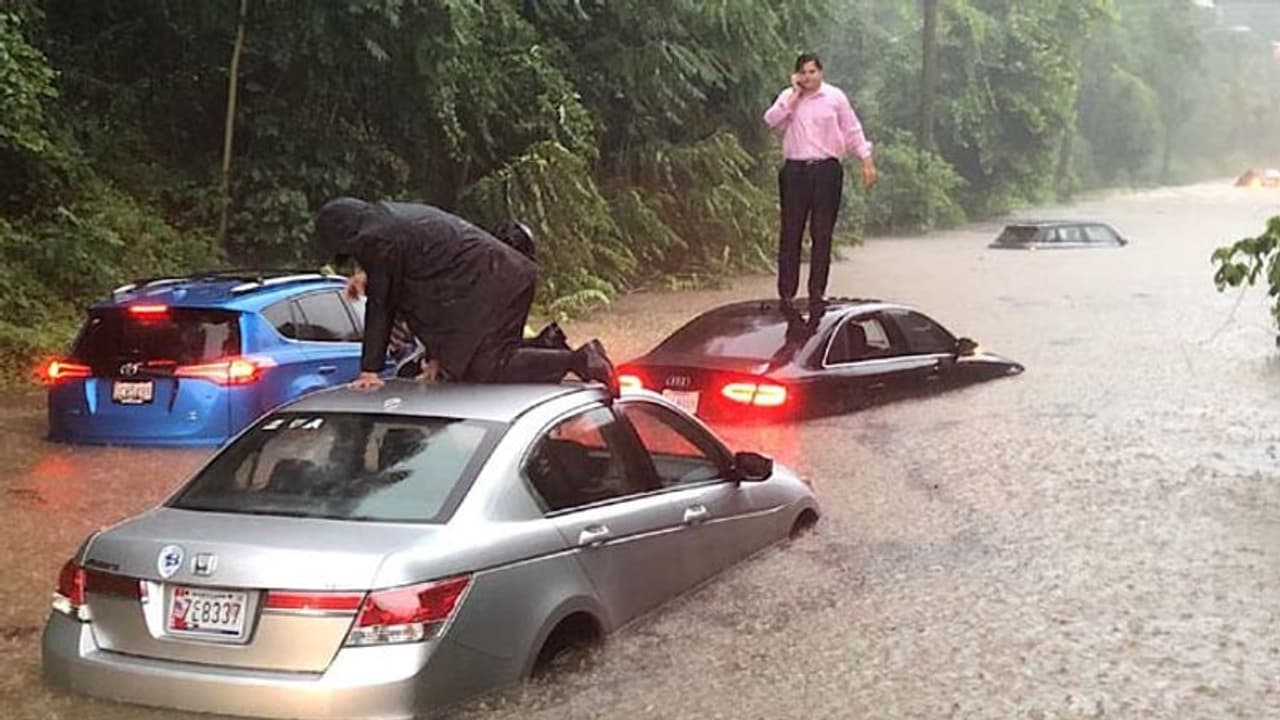 అమెరికాను భారీ వర్షాలు ముంచెత్తుతున్నాయి. దీంతో పలు నగరాలు జలదిగ్భంధంలో చిక్కుకున్నాయి. రోడ్లు జలమయం కావడంతో కొన్ని ప్రాంతాల్లో కార్లు నీటిలో మునిగిపోయాయి. దీంతో వాహనదారులు వాటిపైకి ఎక్కి సాయం కోసం ఎదురుచూస్తున్నారు.