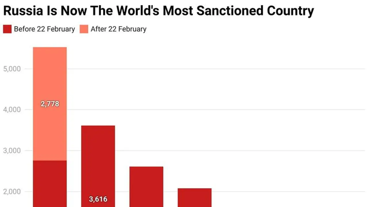 ప్రపంచంలో ఇప్పటివరకు అత్యధిక ఆంక్షలు అనుభవిస్తున్న దేశాలను రష్యా అధిగమించింది. ఇప్పటివరకు అత్యధిక ఆంక్షలతో ప్రపంచంలోనే టాప్ లో ఉన్న ఇరాన్ (3,616 ఆంక్షలు) ను అధిగమించిందని Castellum.AI పేర్కొంది. ఈ సైట్ పేర్కొన్న వివరాల ప్రకారం.. రష్యాపై అత్యధికంగా ఆంక్షలు విధించిన దేశాలను గమనిస్తే.. స్విట్జర్లాండ్ (568), యూరోపియన్ యూనియన్ (518), కెనడా (454), ఆస్ట్రేలియా (413), US (243), UK (35), జపాన్ ( 35) దేశాలు అత్యధికంగా ఆంక్షలు విధించాయి. ఉక్రెయిన్పై దాడిని అడ్డుకునేందుకు ప్రపంచ దేశాలు రష్యాపై ఆంక్షలు విధిస్తున్నాయి.