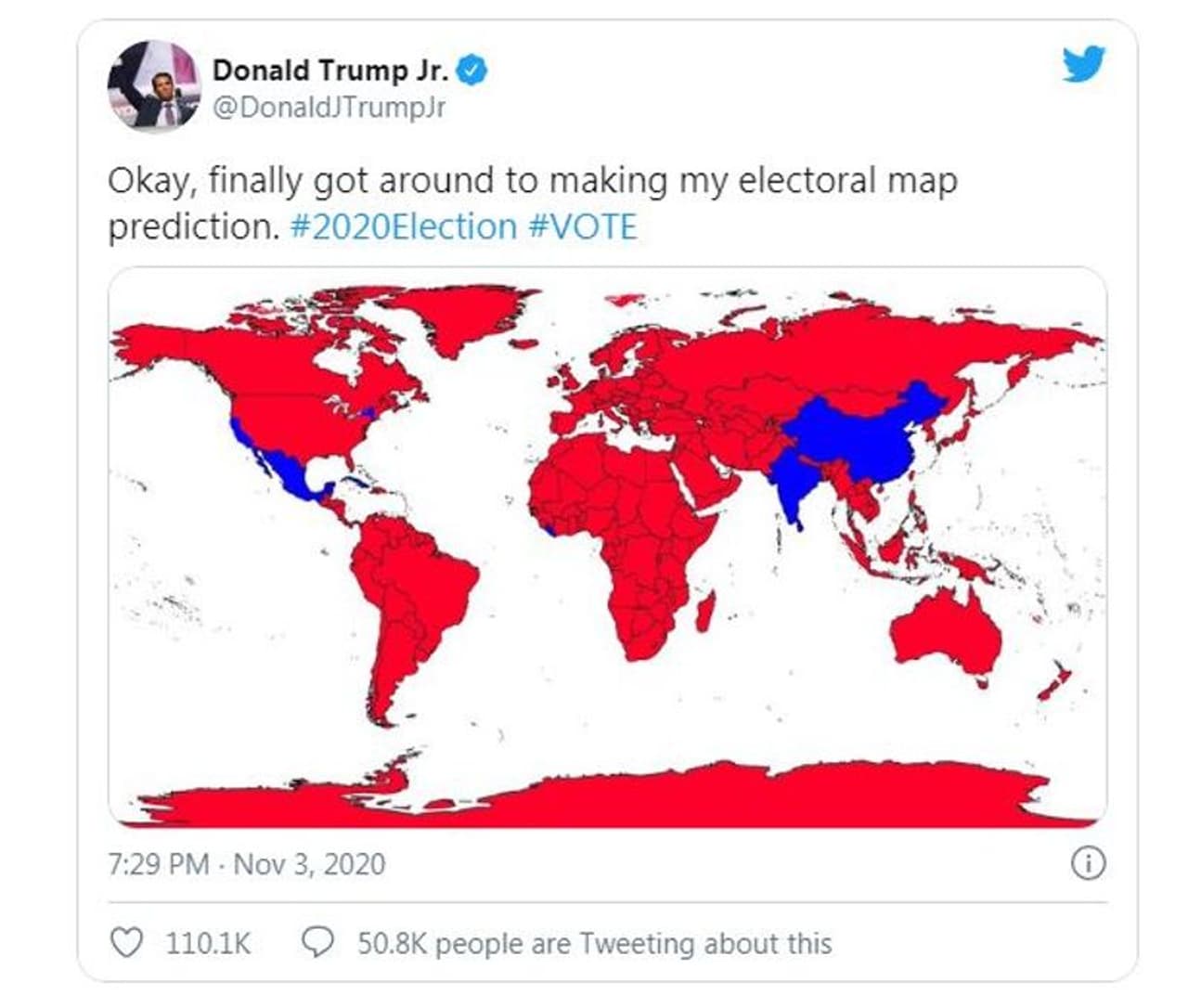 డొనాల్డ్ ట్రంప్ జూనియర్ తన ట్విట్టర్ అక్కౌంట్ లో పోస్ట్ చేసిన ఎన్నికల పోల్ ఫలితాలను అంచనా వేస్తున్న మ్యాప్ లో భారతదేశం మినహా మిగతా దేశాలన్నీ ప్రధానంగా ఎరుపు రంగుతో ప్రపంచ పటాన్ని చూపిస్తుంది, కానీ ఇండియాని నీలం రంగులో చూపించారు,