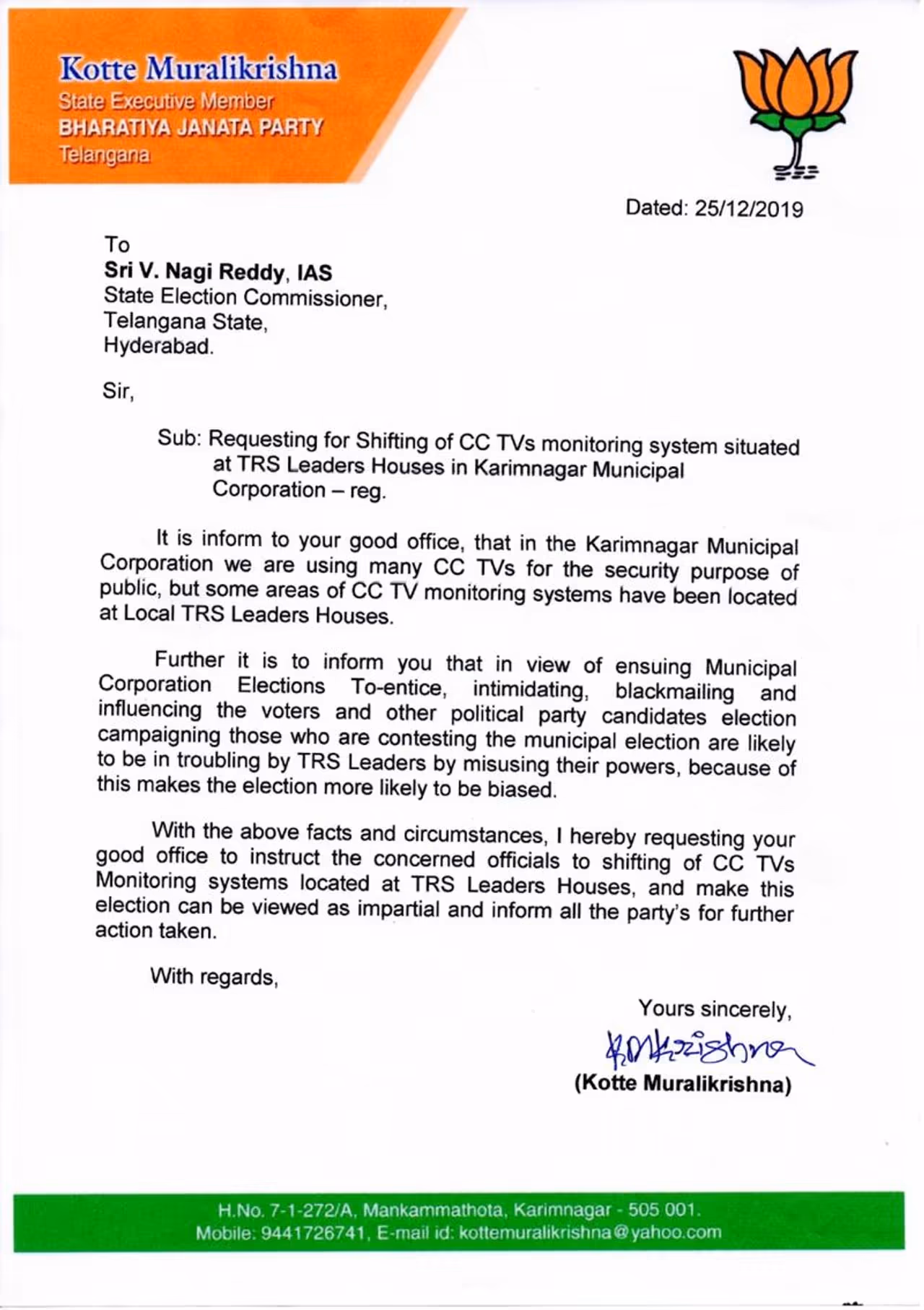 కాబట్టి మున్సిపల్ ఎలక్షన్స్ సమయంలో ఎన్నికల సంఘం ప్రత్యేక దృష్టి సారించి సీసీటీవీ ఆపరేటింగ్ కమాండ్ కంట్రోల్ సిస్టంలను టిఆర్ఎస్ నేతల ఇళ్ల నుంచి తొలగించాలని రాష్ట్ర ఎన్నికల సంఘానికి ఇచ్చిన ఫిర్యాదులో కొట్టె మురళీకృష్ణ పేర్కొన్నారు.