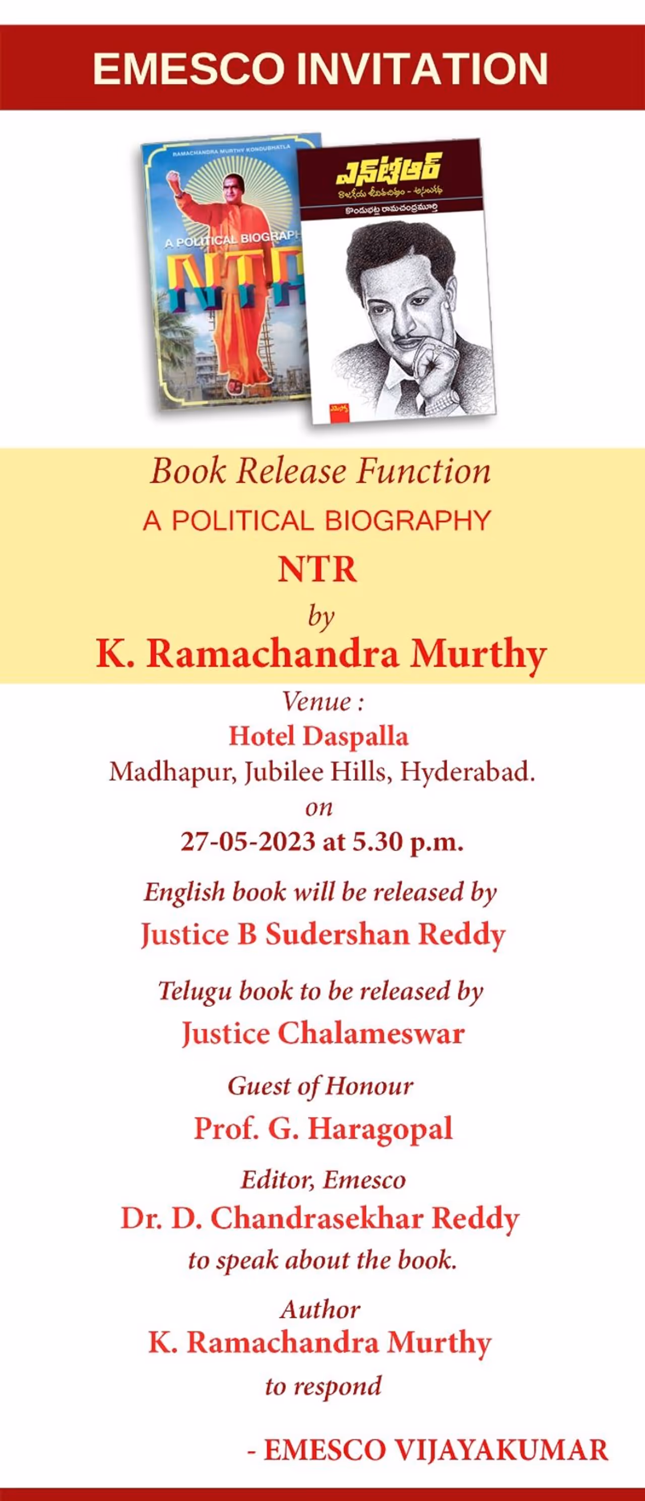 సీనియర్ ఎన్టీఆర్ మీద సీనియర్ పాత్రికేయులు, సంపాదకులు కె.రామచంద్రమూర్తి రాసిన ‘ఎ పొలిటికల్ బయోగ్రఫీ ఎన్టీఆర్’ శనివారం జరగనుంది.
