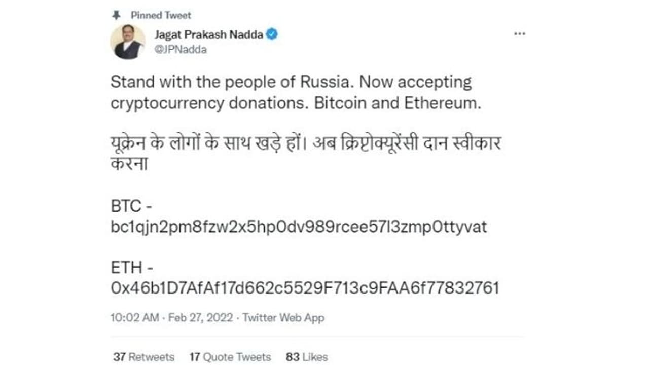 JP Nadda's Twitter: భారతీయ జనతా పార్టీ (బిజెపి) జాతీయ అధ్యక్షుడు జెపి నడ్డా ట్విట్టర్ ఖాతా హ్యాక్ చేయబడింది. వారి ప్రమేయం లేకుండా.. ఉక్రేనియన్ల కోసం క్రిప్టోకరెన్సీ విరాళాలు కోరుతూ ఆదివారం ఉదయం ఒక ట్వీట్ పోస్ట్ చేయబడింది.