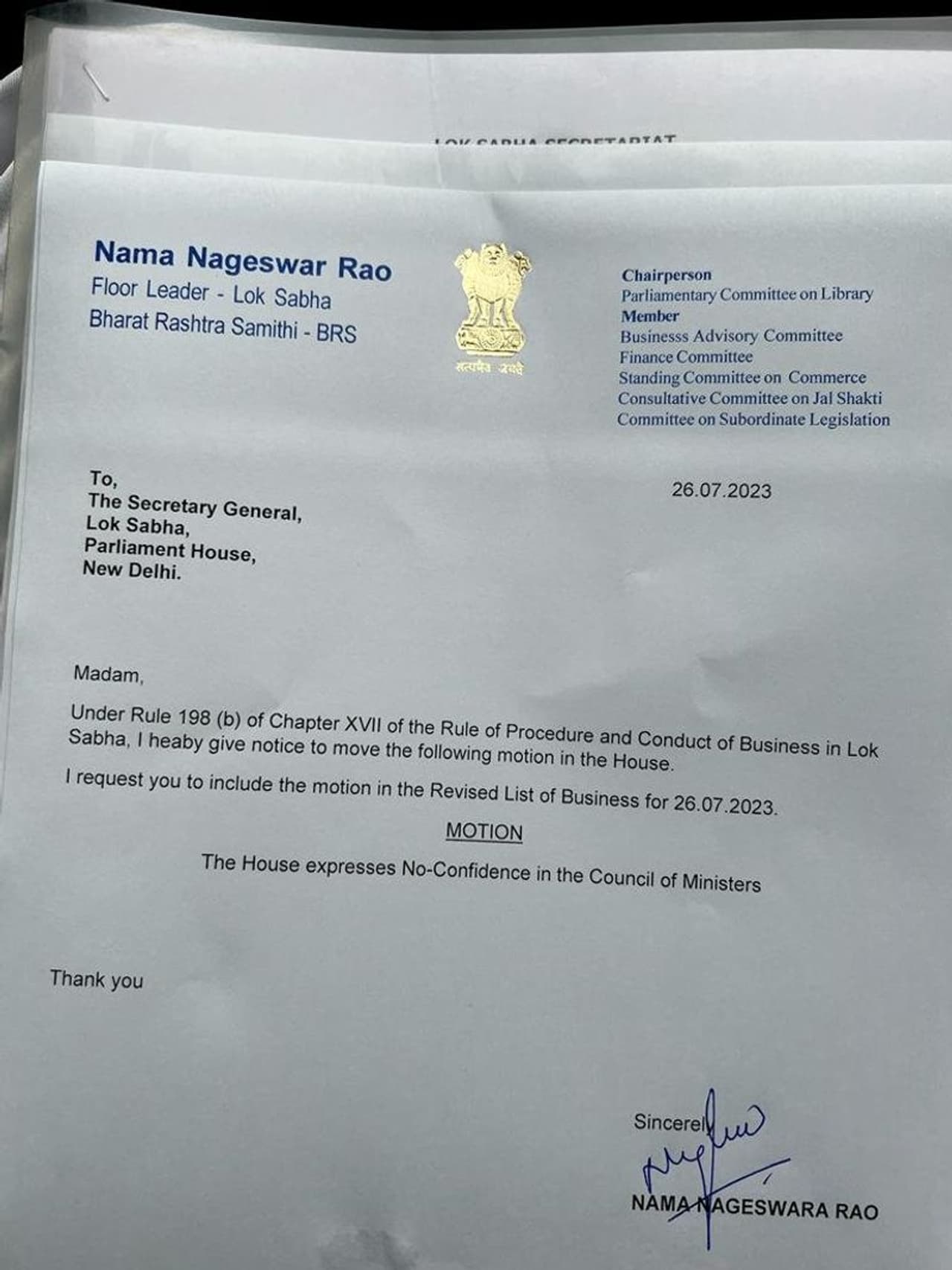 పార్లమెంట్ వర్షాకాల సమావేశాలను మణిపూర్ అంశం కుదిపేస్తున్న సంగతి తెలిసిందే. మణిపుర్ అంశంపై పార్లమెంటులో ప్రధాని మోదీ సమగ్ర ప్రకటన చేయాలని విపక్ష కూటమి ‘‘ఇండియా’’ పట్టుబుడుతుంది. ఈ క్రమంలోనే కేంద్ర ప్రభుత్వంపై కాంగ్రెస్ పార్టీ బుధవారం రోజున లోక్సభలో అవిశ్వాస తీర్మానం ప్రవేశపెట్టింది. లోక్సభలో కాంగ్రెస్ డిప్యూటీ నేత గౌరవ్ గొగొయ్ ప్రభుత్వంపై అవిశ్వాస తీర్మానం ప్రవేశపెట్టేందుకు స్పీకర్ కార్యాలయానికి నోటీసులు ఇచ్చారు. మరోవైపు లోక్సభలో బీఆర్ఎస్ పక్షనేత నామా నాగేశ్వరరావు కూడా కేంద్ర ప్రభుత్వంపై అవిశ్వాస తీర్మాన నోటీసు ఇచ్చారు. ఈ మేరకు లోక్సభ సెక్రటరీ జనరల్కు ఎంపీ నామా నాగేశ్వరరావు లేఖ రాశారు.