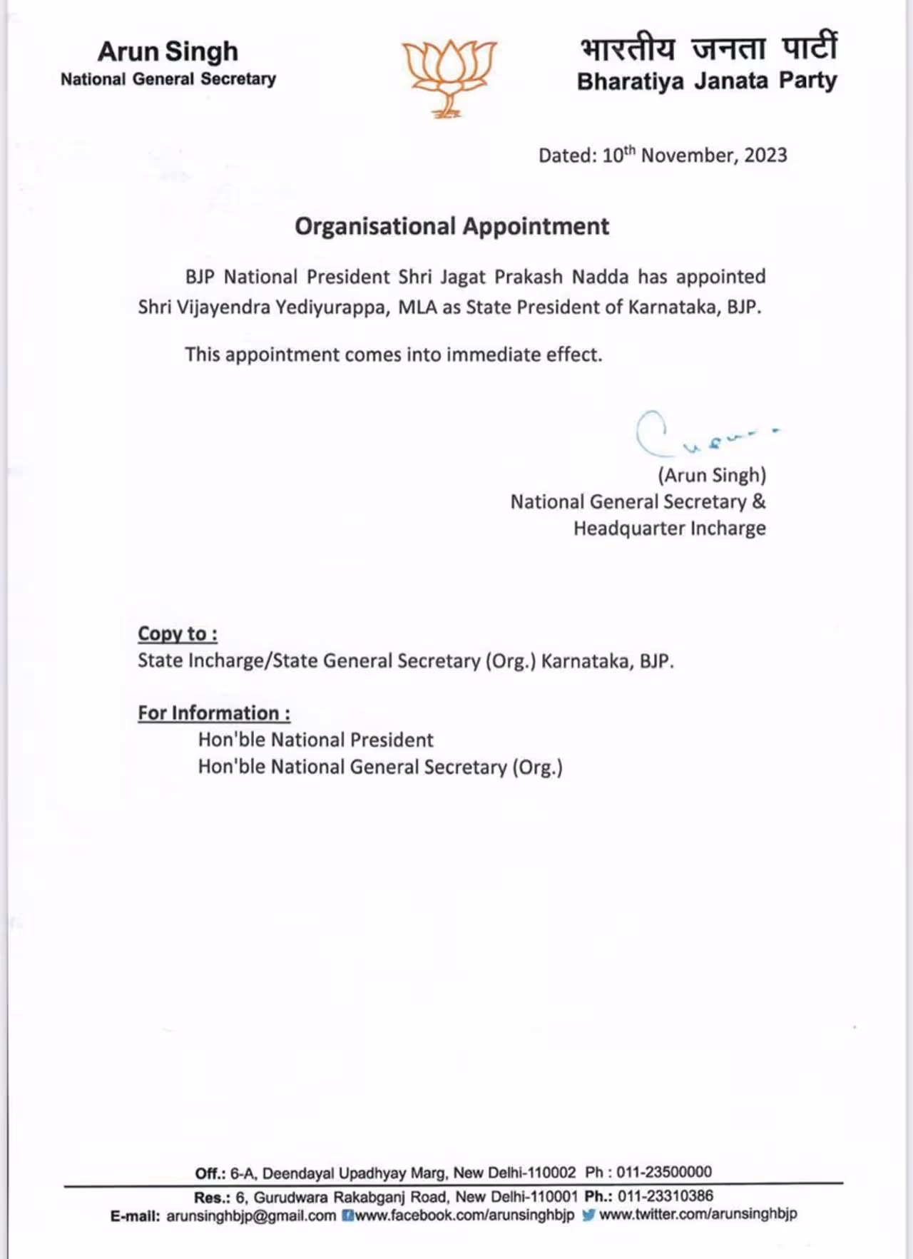 భారతీయ జనతా పార్టీ (బీజేపీ) కర్ణాటక రాష్ట్ర అధ్యక్షుడిగా మాజీ సీఎం బీఎస్ యడియూరప్ప కుమారుడు విజయేంద్ర యడియూరప్ప నియమితులయ్యారు. ఈ మేరకు బీజేపీ జాతీయ అధ్యక్షుడు జేపీ నడ్డా ఆదేశాలు జారీ చేశారు.