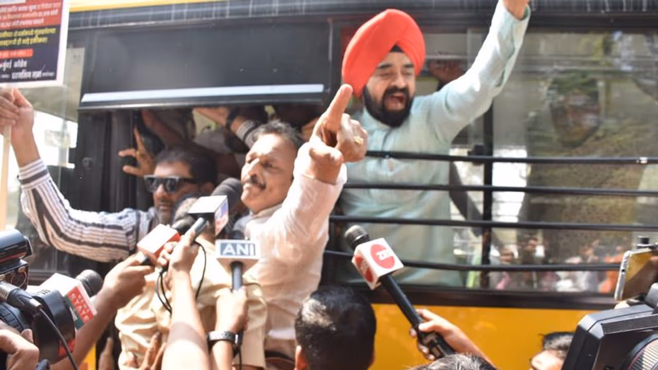 #WATCH | Mumbai police detain Congress leaders who were protesting against Gautam Adani, outside NSE stock exchange in Mumbai pic.twitter.com/s38mMGm4NR