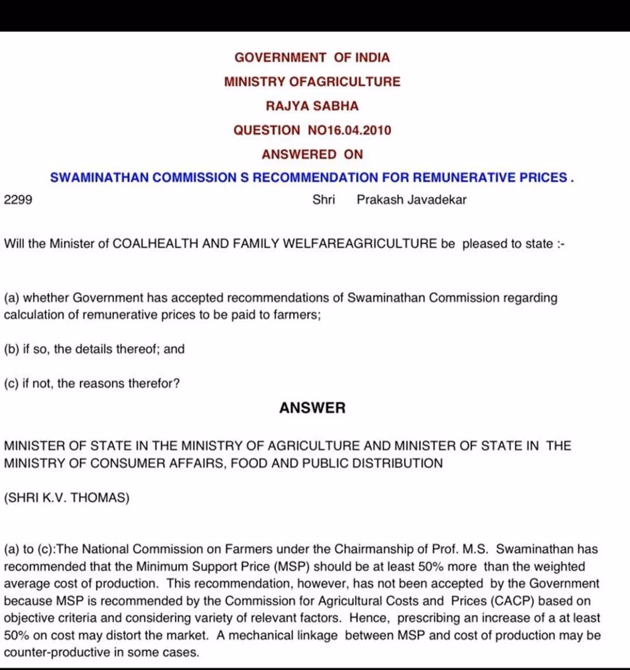 స్వామినాథన్ కమీషన్ ను తిరస్కరించినట్లు స్వయంగా యూపిఏ హయాంలో ఆనాటి కేంద్ర మంత్రి కేవి.థామస్ ప్రకటించారు. ఆనాటి బిజెపి ఎంపీ ప్రకాష్ జవదేకర్ రాజ్యసభలో స్వామినాథన్ కమీషన్ సిపార్సులను ఆమోదించారా? లేదా? అని ప్రశ్నించారు. అందుకు థామస్ లిఖితపూర్వకంగా సమాధానం చెప్పారు.