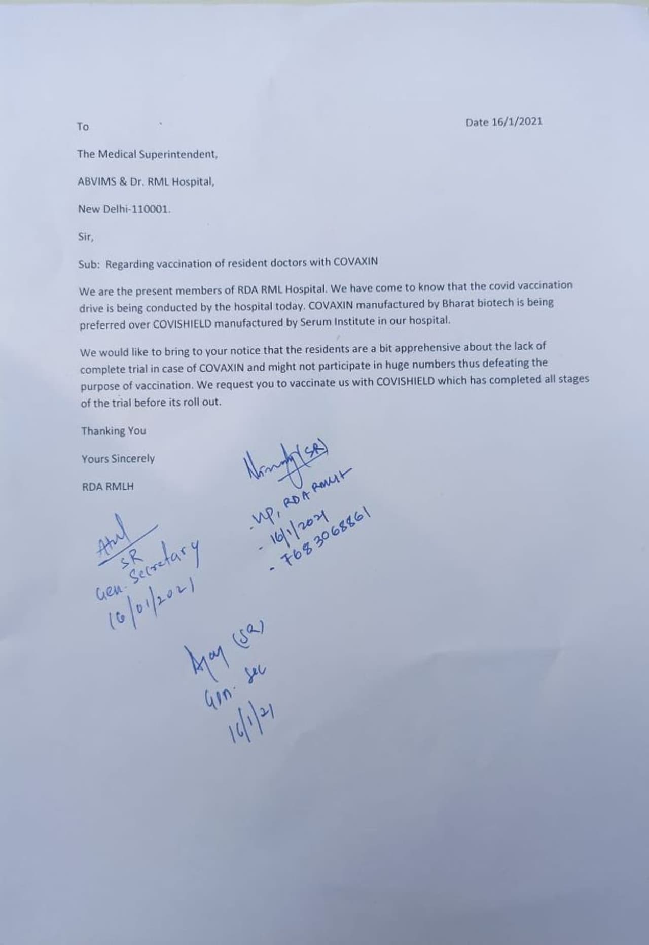 కోవాగ్జిన్ తమకు అక్కర్లేదు అంటూ రామ్ మనోహర్ లోహియా ఆసుపత్రి వైద్యులు మెడికల్ సూపరింటెండెంట్ కి ఒకలేఖను రాసారు. సోషల్ మీడియాలో అనేకమంది ఇలా కన్సెన్ట్ ఫారం పై సంతకం పెట్టడాన్ని తీవ్రంగా వ్యతిరేకిస్తున్నారు.