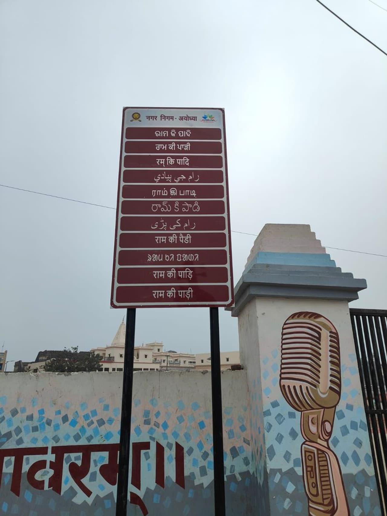 రామ్ కీ పైడి, నాగేశ్వర్ నాథ్ ఆలయం, భజన్ సంధ్యా స్థల్ నయా ఘాట్, క్వీన్ హో పార్క్, లతా మంగేష్కర్ చౌక్, రాంపథ్, జన్మభూమి మార్గం, భక్తిపథ్, ధర్మపథ్, చౌదరి చరణ్ సింగ్ ఘాట్, రామకథా మ్యూజియం, జానకీ మహల్, దశరథ్ మహల్, రాంకోట్యాల్, రాంకోట్యాల్, రాంకోట్, ఛోటీ దేవ్కాళి ఆలయం, సరయూ ఘాట్, సూర్య కుండ్, గుప్తర్ ఘాట్, గులాబ్ బారి, కంపెనీ గార్డెన్, సాకేత్ సదన్, దేవాలయం సమీపంలో గుప్తర్ ఘాట్, చౌదరి చరణ్ సింగ్ పార్క్, సంత్ తులసి ఘాట్, తివారీ మందిర్, తులసి ఉద్యాన్, గోరఖ్పూర్-లక్నో బైపాస్, బైకుంత్ ధామ్, మిథిలా ధామ్, అయోధ్య ఐ హాస్పిటల్, హనుమాన్ గర్హి రోడ్, రాజ్ద్వార్ మందిర్ తిరహా, కనక్ భవన్ రోడ్, దిగంబర్ జైన్ టెంపుల్, శ్రీ రామ్ హాస్పిటల్, రామ్ కచేరీ, రంగ్మహల్, అమావా రం మందిర్, సీతాకుండ్, మణి పర్వతం, అయోధ్య ధామ్ రైల్వే స్టేషన్లలో ఆయా భాషల్లో సైన్ బోర్డులు ఏర్పాటు చేసే ప్రక్రియ వేగంగా జరుగుతోంది.