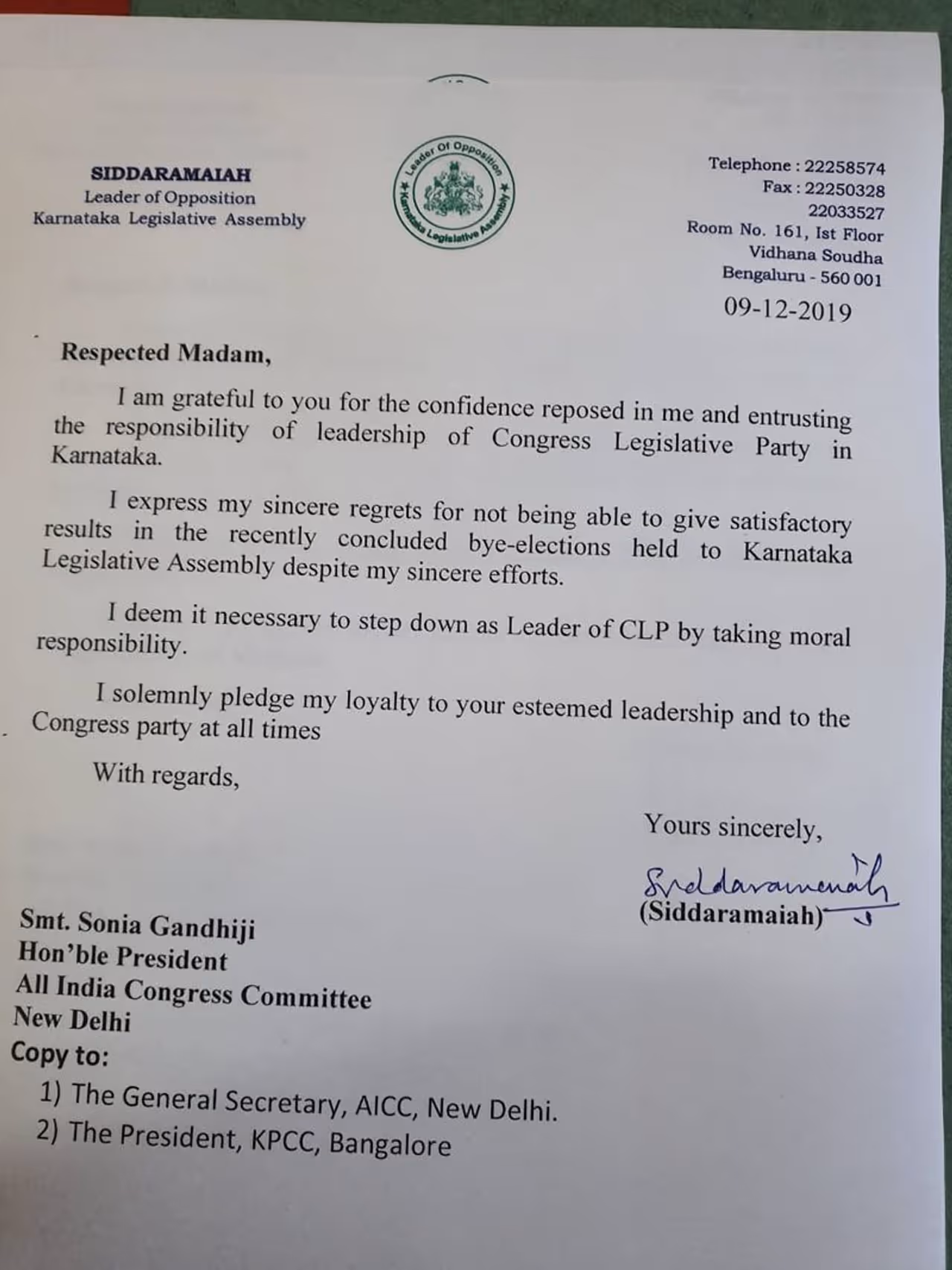 పార్టీలోని కొందరి సూచన మేరకు ప్రతిపక్షనేత పదవికి తాను రాజీనామా చేశానని, రాజీనామా లేఖను కాంగ్రెస్ అధినేత్రి సోనియా గాంధీకి, రాష్ట్ర కాంగ్రెస్ వ్యవహారాల ఇన్ఛార్జ్ కేసీ వేణుగోపాల్, కేపీసీసీ అధ్యక్షుడు దినేశ్ గుండూ రావుకు పంపారు.