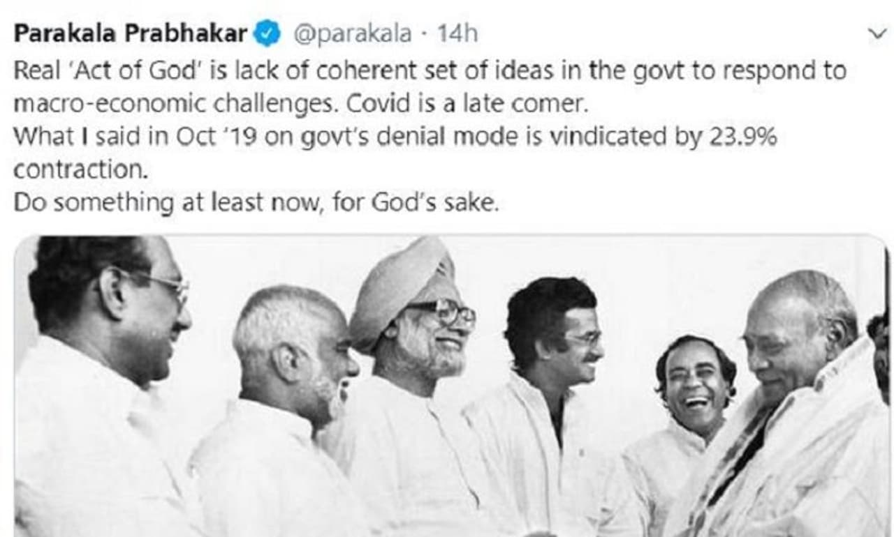 "నిజమైన ఆక్ట్ అఫ్ గాడ్ అంటే స్థూల ఆర్ధిక సవాళ్ళను తగిన రీతిలో ఎదుర్కోలేకపోవటం(కరోనా కాదు), కరోనా ఆ తరువాత వచ్చింది. ఆర్ధిక వ్యవస్థ గాడి తప్పుతోందని, ప్రభుత్వం దాన్ని అంగీకరించడంలేదని, తాను గత అక్టోబర్ లోనే చెప్పానని, అదే ఇప్పుడు జీడీపీ గణాంకాల రూపంలో తేటతెల్లమైంది. కనీసం ఇప్పటికైనా ఆ భగవంతుడి కోసమైనా ఏదో ఒకటి చేయండి" అంటూ ప్రభుత్వ ఆర్ధిక విధానాలపై దుమ్మెత్తిపోశారు పరకాల ప్రభాకర్.