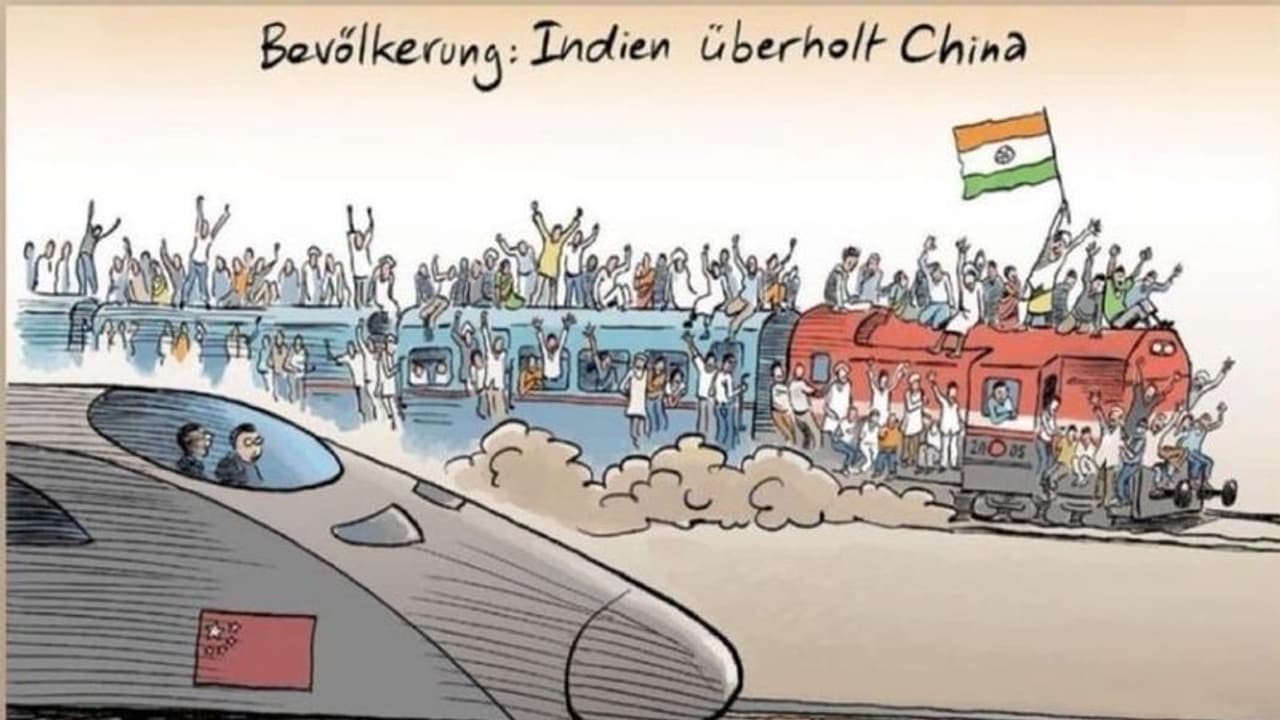భారత్ లో జనాభా ఇటీవల చైనాను అధిగమించింది. దీనిపై జర్మనీకి చెందిన ఓ మ్యాగజైన్ వ్యంగ్యంగా కార్డున్ గీసింది. ఈ కార్టున్ పై నెటిజన్లు తీవ్రంగా మండిపడుతున్నారు. కేంద్ర మంత్రులు, పలు రాజకీయ పార్టీల ముఖ్య నాయకులు జర్మనీని నిందిస్తున్నారు. జర్మన్ మ్యాగజైన్ డెర్ స్పీగెల్ ప్రచురించిన కార్టూన్ లో.. భారతదేశ ప్రజలు ఓ రైలులో కిక్కిరిసి ఓ ట్రాక్ పై వెళ్తున్నారు. పక్క నుంచి చైనాకు చెందిన బుల్లెట్ ట్రైన్ ఈ రైలును దాటి ముందుకు వెళ్తోంది. ఆ బుల్లెట్ ట్రైన్ లో కూర్చున్న లోకో పైలెట్లు మన రైలు, అందులో పైనా, లోపల కూర్చున్న ప్రయాణికులను చూసి ఆశ్చర్యపోతున్నారు.