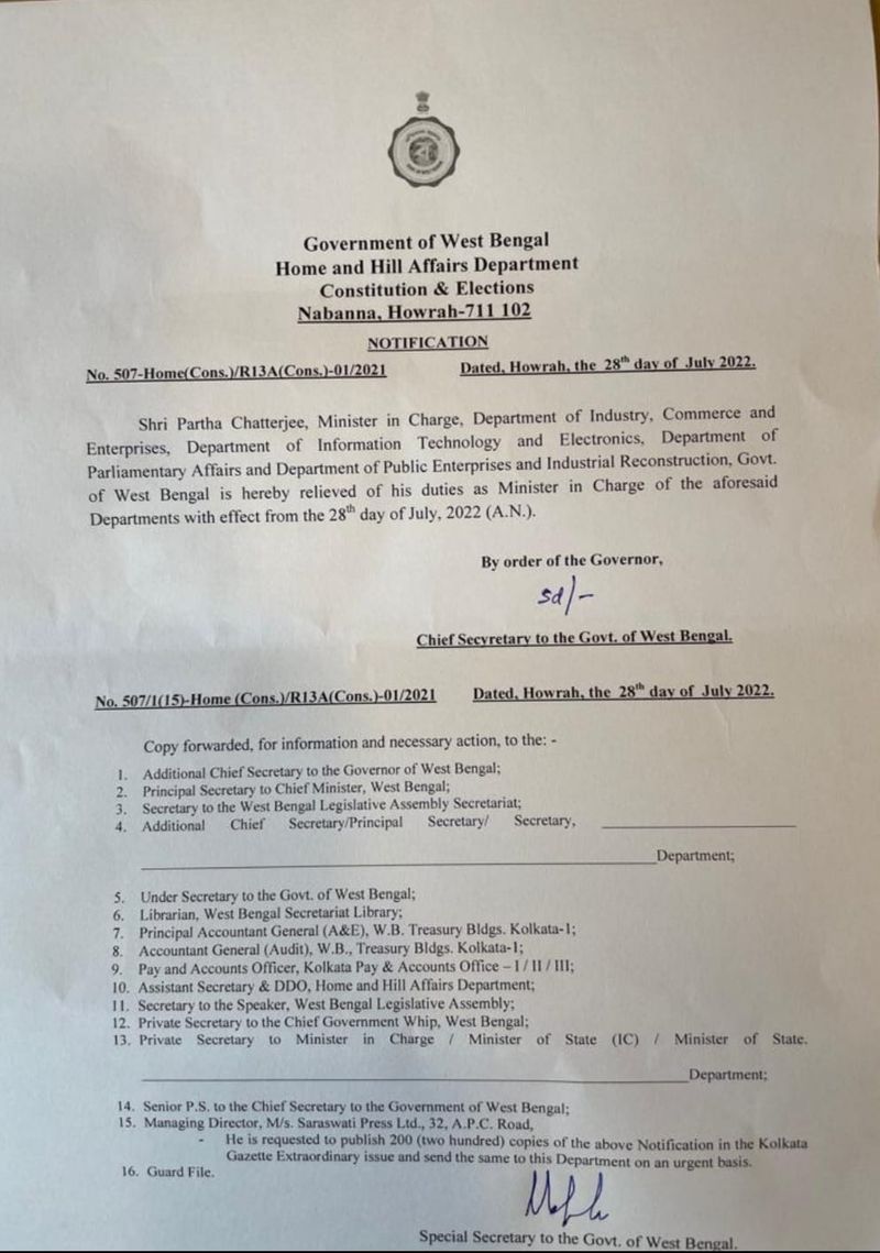 పశ్చిమ బెంగాల్లో సంచలనం సృష్టించిన స్కూల్ సర్వీస్ కమిషన్ రిక్రూట్మెంట్ కుంభకోణం కేసులో ఈడీ అరెస్ట్ చేసిన పార్థ సారథిని మంత్రి వర్గం నుంచి తొలగించారు. ఈ మేరకు బెంగాల్ ప్రభుత్వం ఉత్తర్వులు జారీ చేసింది. పార్థ చటర్జీని మంత్రి వర్గంలోని అన్ని పదవుల నుంచి తొలగించాలని డిమాండ్స్ పెరుగుతున్న నేపథ్యంలో నేడు బెంగాల్ కేబినెట్ భేటీ అయింది. బెంగాల్ ముఖ్యమంత్రి మమతా బెనర్జీ అధ్యక్షతన జరిగిన ఈ సమావేశంలో పార్థ చటర్జీని మంత్రివర్గం నుంచి తొలగిస్తూ నిర్ణయం తీసుకున్నారు. టీఎంసీ సెక్రటరీ జనరల్ అయిన ఛటర్జీ రాష్ట్ర మంత్రివర్గంలో వాణిజ్యం - పరిశ్రమలు, పార్లమెంటరీ వ్యవహారాలు, ఇన్ఫర్మేషన్ టెక్నాలజీ - ఎలక్ట్రానిక్స్, పబ్లిక్ ఎంటర్ప్రైజెస్ అండ్ ఇండస్ట్రియల్ రీకన్స్ట్రక్షన్ శాఖల బాధ్యతలు నిర్వహించారు.