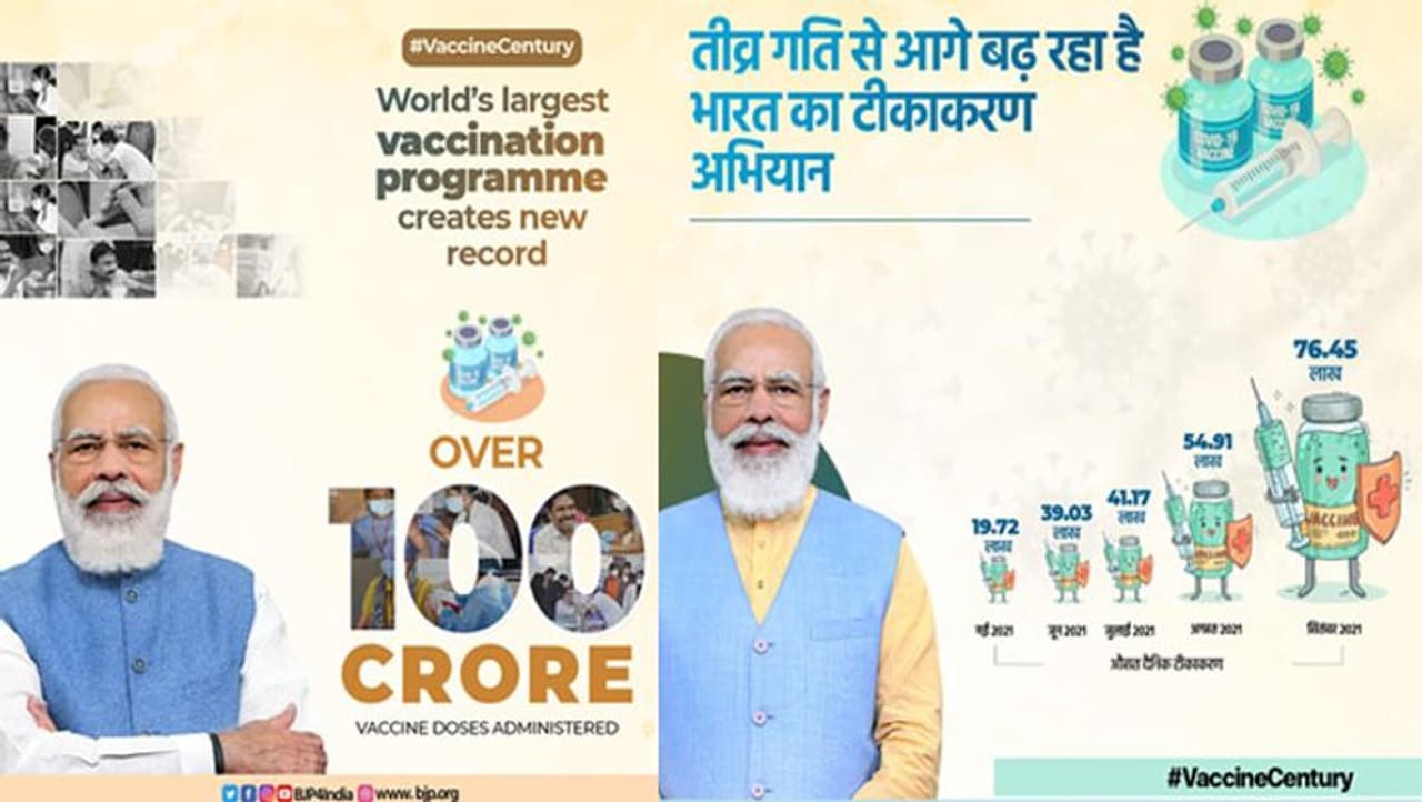 PM మోడీ ప్రొఫైల్ పిక్చర్, "అభినందనలు ఇండియా -100 కోట్ల COVID-19 వ్యాక్సిన్ డోస్లు విజయవంతంగా పూర్తి చేశాం" అని క్యాప్షన్ ఉంది. ఈ రికార్డ్ సాధించిన తరువాత ప్రధాని మోడీ శుక్రవారం దేశాన్ని ఉద్దేశించి ప్రసంగించారు, ఈ సమయంలో 100 కోట్ల వ్యాక్సిన్ డోస్ మైలురాయిని దాటినందుకు ప్రశంసించారు.