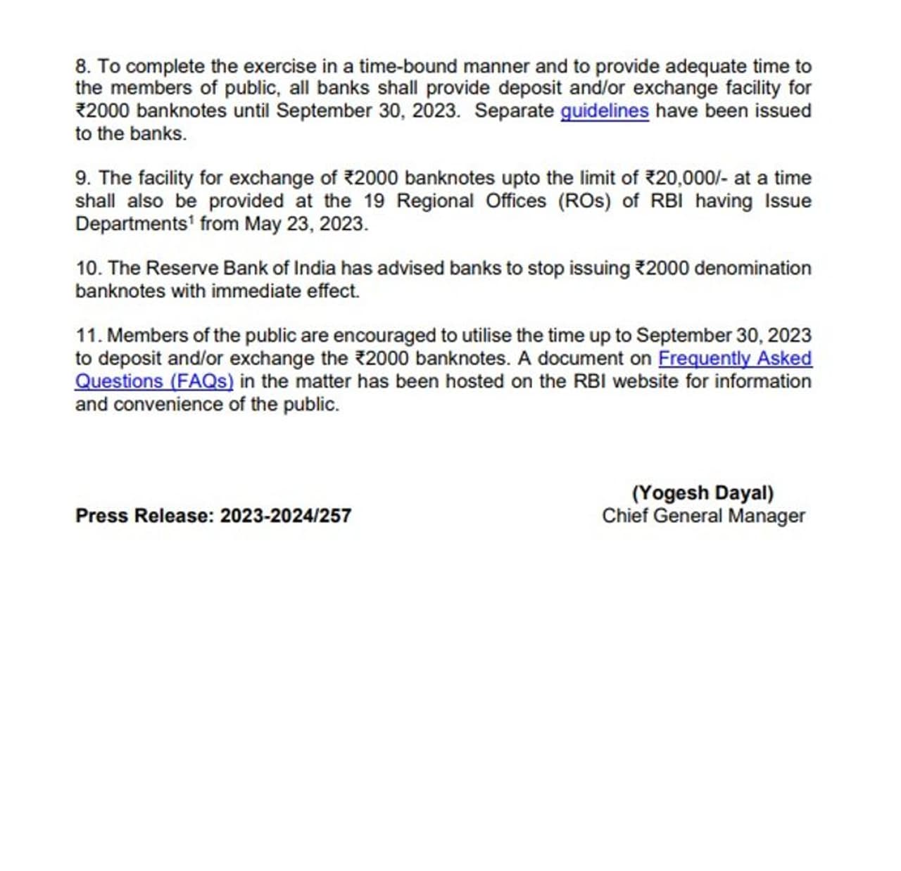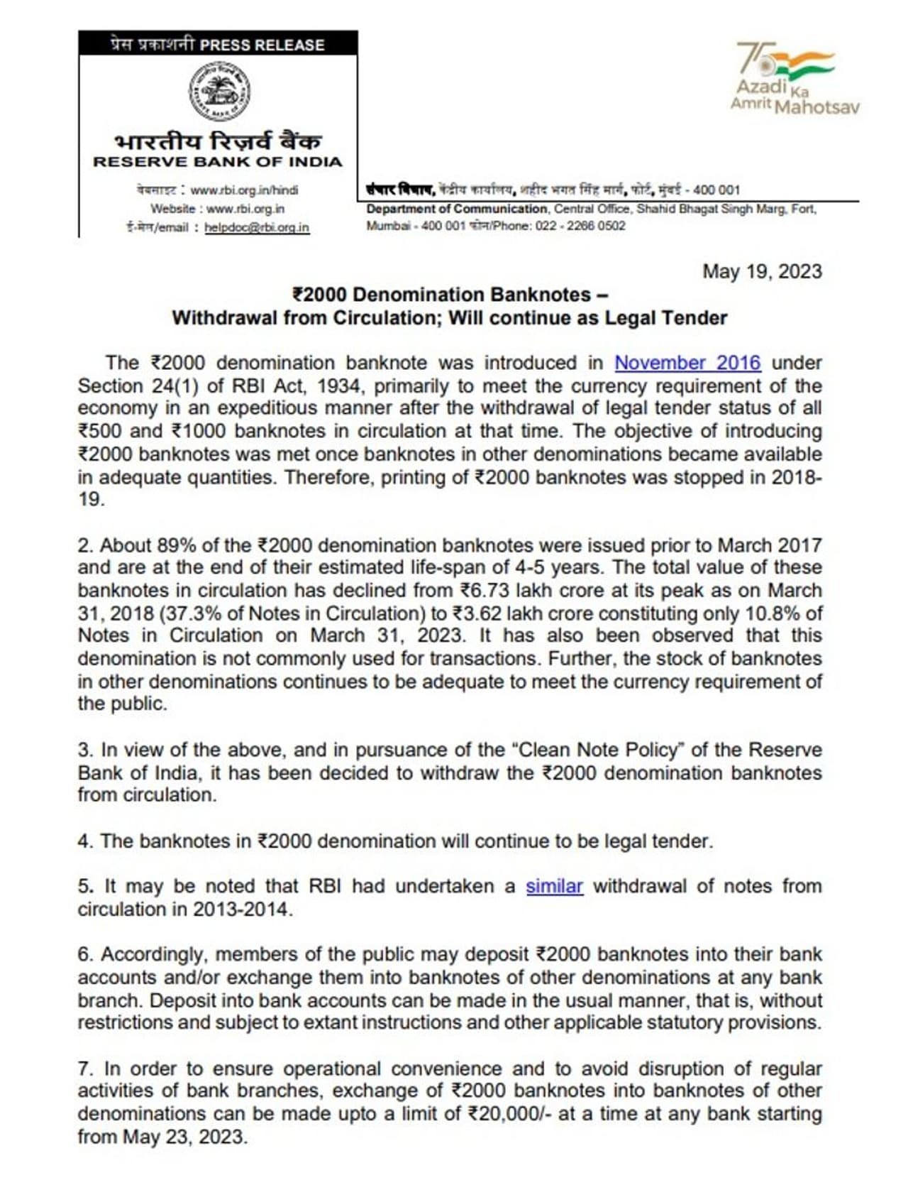 2018-19 ఆర్ధిక సంవత్సరంలోనే రూ.2 వేల నోట్ల ముద్రణ నిలిపివేశామని ఆర్బీఐ స్పష్టం చేసింది. ఒక విడతలో రూ.20 వేలు మాత్రమే మార్చుకోవడానికి అవకాశం కల్పిస్తున్నట్లు పేర్కొన్నారు. క్లీన్ నోట్ పాలసీలో భాగంగా రూ.2 వేల నోట్లను ఉపసంహరించుకుంటున్నట్లు పేర్కొంది. దేశంలో రూ.3.52 లక్షల కోట్ల విలువైన రూ.2 వేల నోట్లు చెలామణీలో వున్నట్లు ప్రచారం జరుగుతోంది. దీనికి సంబంధించిన మరిన్ని వివరాలు తెలియాల్సి వుంది