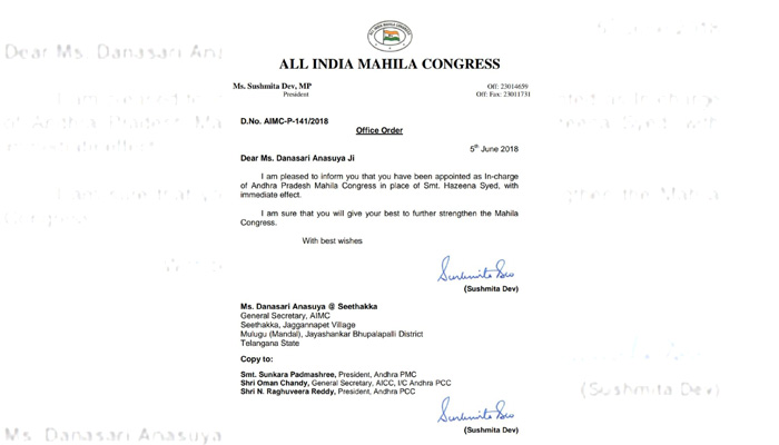 కాంగ్రెస్ నాయకురాలు, ములుగు నియోజకవర్గ మాజీ ఎమ్మెల్యే సీతక్క అలియాస్ దనసరి అనసూయకు మరో పోస్టు దక్కింది. ఇప్పటికే ఆమె ఎఐసిసి మహిళా కాంగ్రెస్ జాతీయ ప్రధాన కార్యదర్శిగా బాధ్యతలు అప్పగించింది కాంగ్రెస్ పార్టీ.